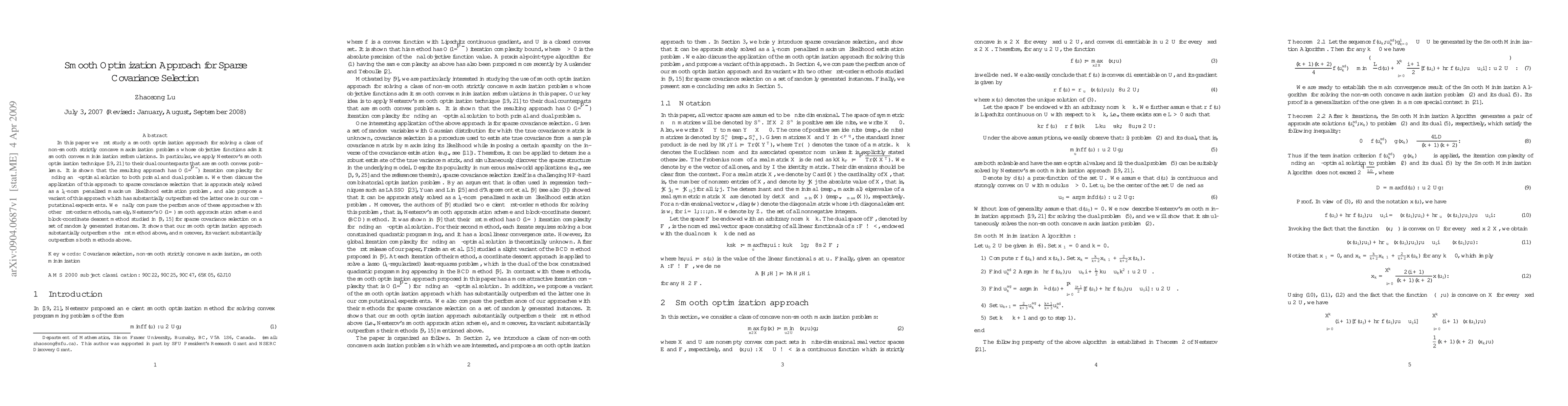 This paper proposes a smooth optimization approach based on Nesterov's technique to solve sparse covariance selection problems, achieving ${\cal O}(1/\sqrt{\epsilon})$ iteration complexity. The method outperforms existing first-order methods in computational experiments and comparisons.