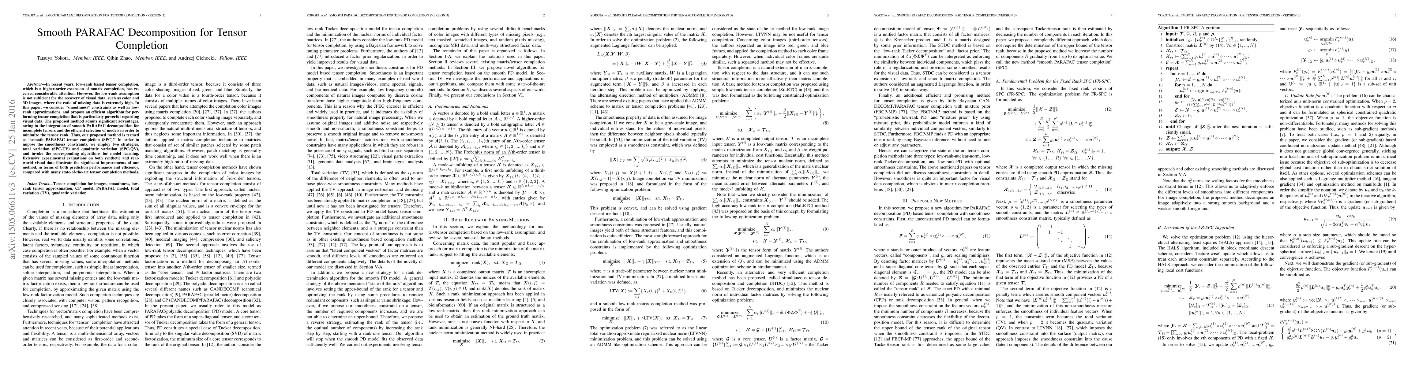 This paper proposes an efficient tensor completion algorithm termed "smooth PARAFAC tensor completion (SPC)" that integrates smoothness constraints with low-rank approximations to better handle visual data with high missing data ratios. The method employs total variation and quadratic variation strategies to impose smoothness, demonstrating significant improvements in prediction performance and efficiency compared to state-of-the-art methods.