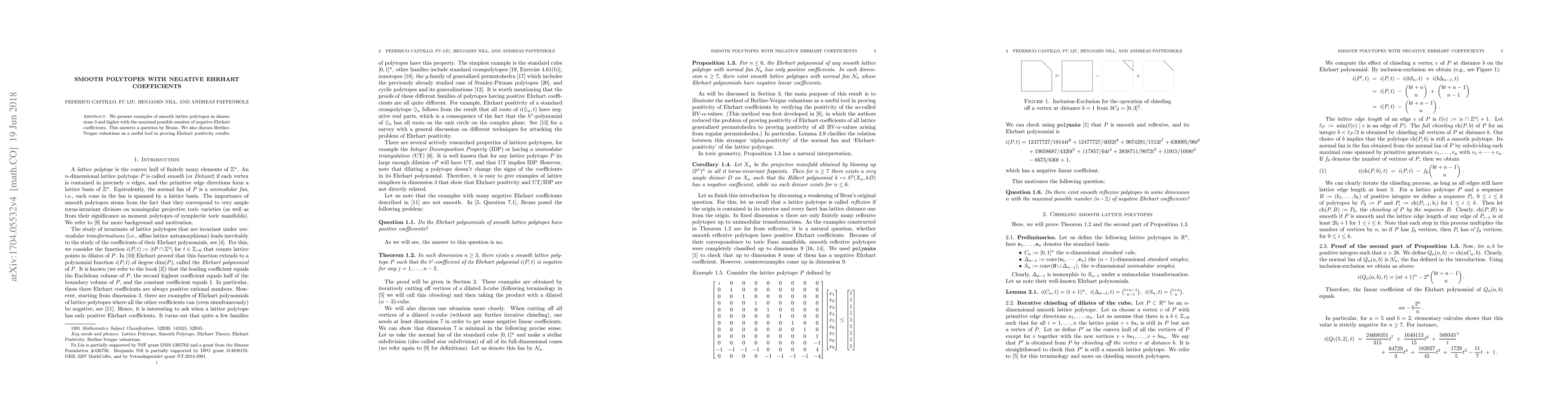 This paper provides examples of smooth lattice polytopes in dimensions 3 and higher with all potentially negative coefficients in their Ehrhart polynomials that are indeed negative, addressing a question by Bruns. It also explores Berline-Vergne valuations as a method for proving Ehrhart positivity.