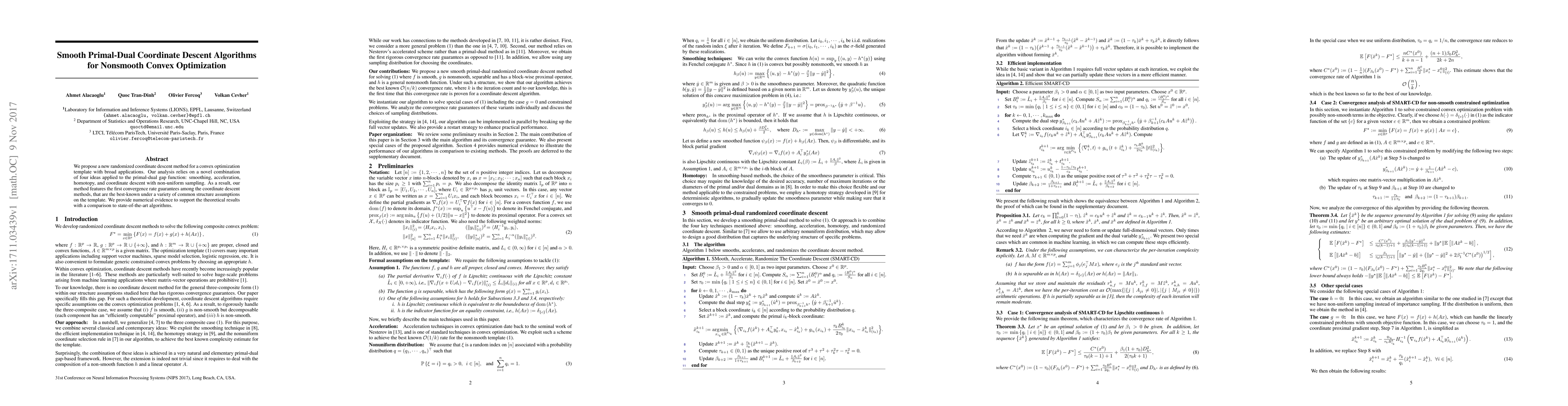 We propose a new randomized coordinate descent method for a convex optimization template with broad applications. Our analysis relies on a novel combination of four ideas applied to the primal-dual gap function: smoothing, acceleration, homotopy, and coordinate descent with non-uniform sampling. As a result, our method features the first convergence rate guarantees among the coordinate descent methods, that are the best-known under a variety of common structure assumptions on the template. We provide numerical evidence to support the theoretical results with a comparison to state-of-the-art algorithms.