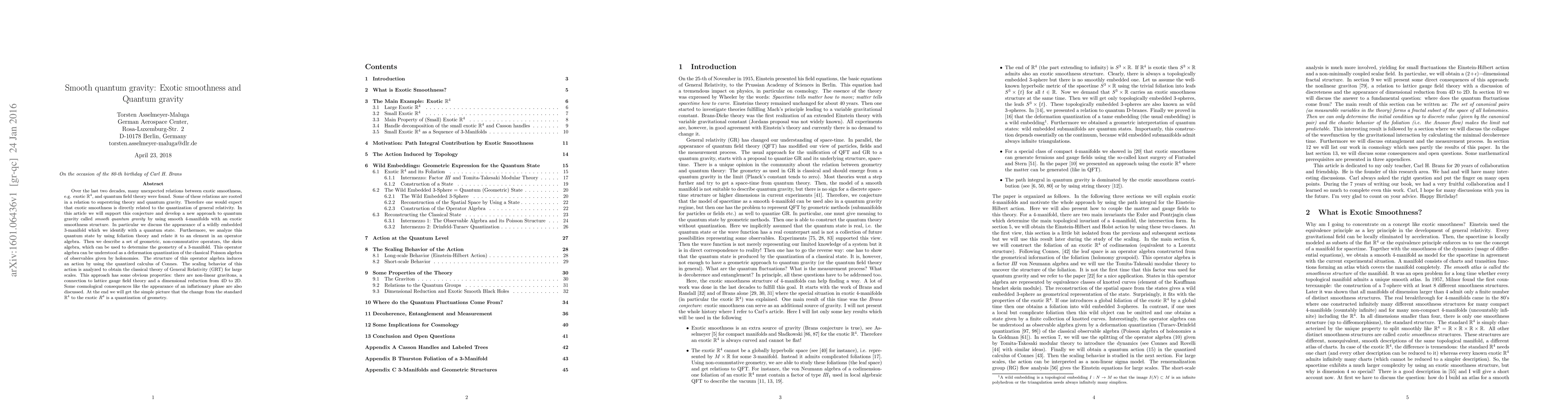 The paper proposes "smooth quantum gravity," a novel approach to quantum gravity utilizing exotic smoothness and smooth 4-manifolds. It introduces geometric, non-commutative operators—a skein algebra—to determine the geometry of 3-manifolds, linking these to the classical theory of General Relativity and discussing cosmological implications like inflation.