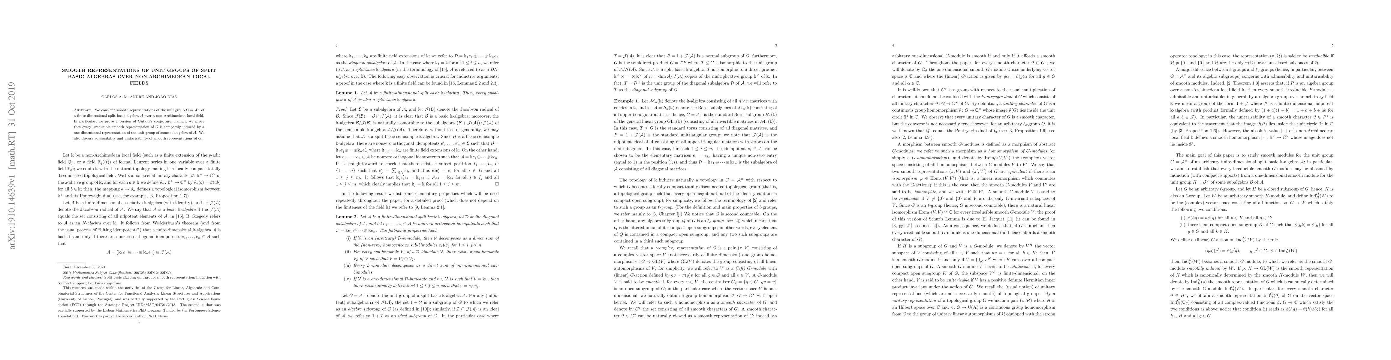 This paper proves a version of Gutkin's conjecture regarding smooth representations of the unit group of a split basic algebra over a non-Archimedean local field, showing every irreducible smooth representation is compactly induced by a one-dimensional representation of a subalgebra's unit group. It also explores the admissibility and unitarisability of these representations.