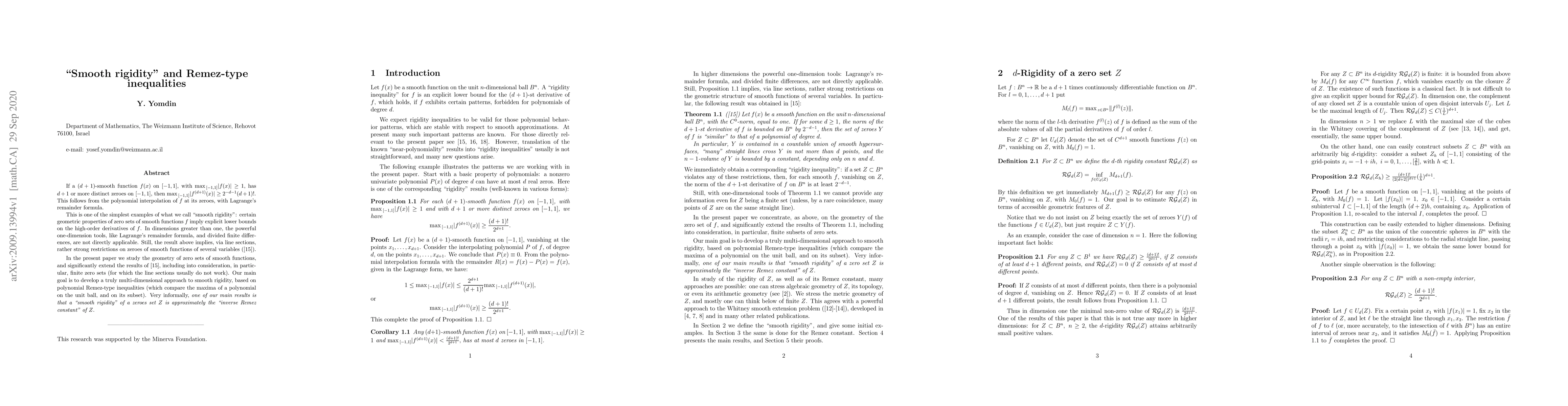 If a smooth function of one variable has maximum one on the unit interval, and has there $d$ zeroes, then its $(d+1)$-st derivative must be "big". This is one of the simplest examples of what we call "smooth rigidity": certain geometric properties of zero sets of smooth functions $f$ imply explicit lower bounds on the high-order derivatives of $f$. In dimensions greater than one, the powerful one-dimension tools, like Lagrange's remainder formula, and divided finite differences, are not directly applicable. Still, the result above implies, via line sections, rather strong restrictions on zeroes of smooth functions of several variables \cite{Yom1}). In the present paper we study the geometry of zero sets of smooth functions, and significantly extend the results of \cite{Yom1}, including into consideration, in particular, finite zero sets (for which the line sections usually do not work). Our main goal is to develop a truly multi-dimensional approach to smooth rigidity, based on polynomial Remez-type inequalities (which compare the maxima of a polynomial on the unit ball, and on its subset). Very informally, one of our main results is that a "smooth rigidity" of a zeroes set $Z$ is approximately the "inverse Remez constant" of $Z$.