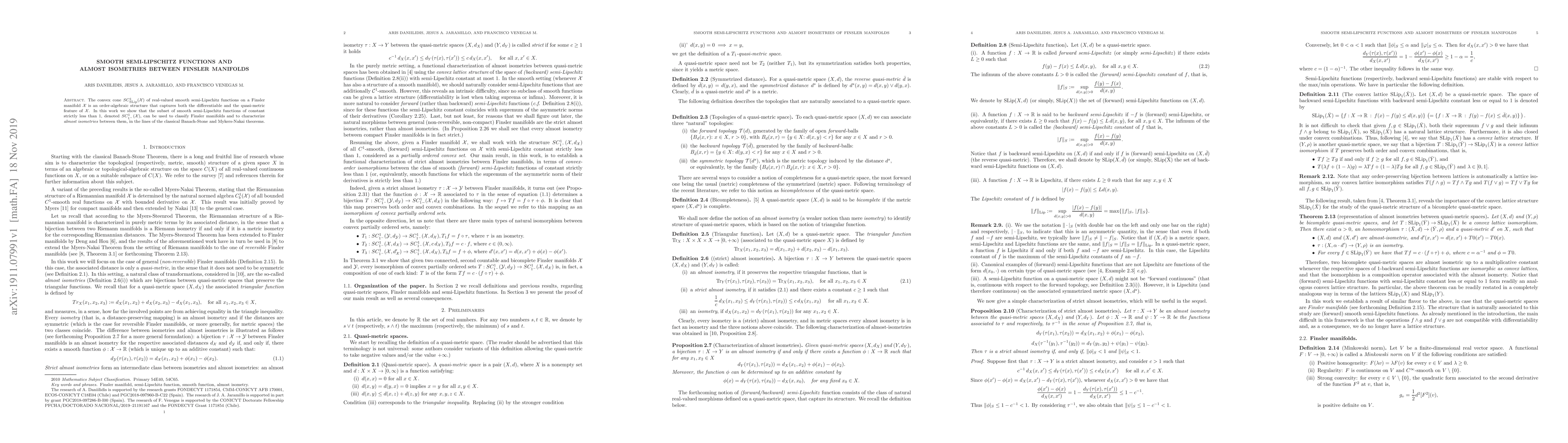 The convex cone $SC_{\mathrm{SLip}}^1(\mathcal{X})$ of real-valued smooth semi-Lipschitz functions on a Finsler manifold $\mathcal{X}$ is an order-algebraic structure that captures both the differentiable and the quasi-metric feature of $\mathcal{X}$. In this work we show that the subset of smooth semi-Lipschitz functions of constant strictly less than $1$, denoted $SC_{1^{-}}^1(\mathcal{X})$, can be used to classify Finsler manifolds and to characterize almost isometries between them, in the lines of the classical Banach-Stone and Mykers-Nakai theorems.