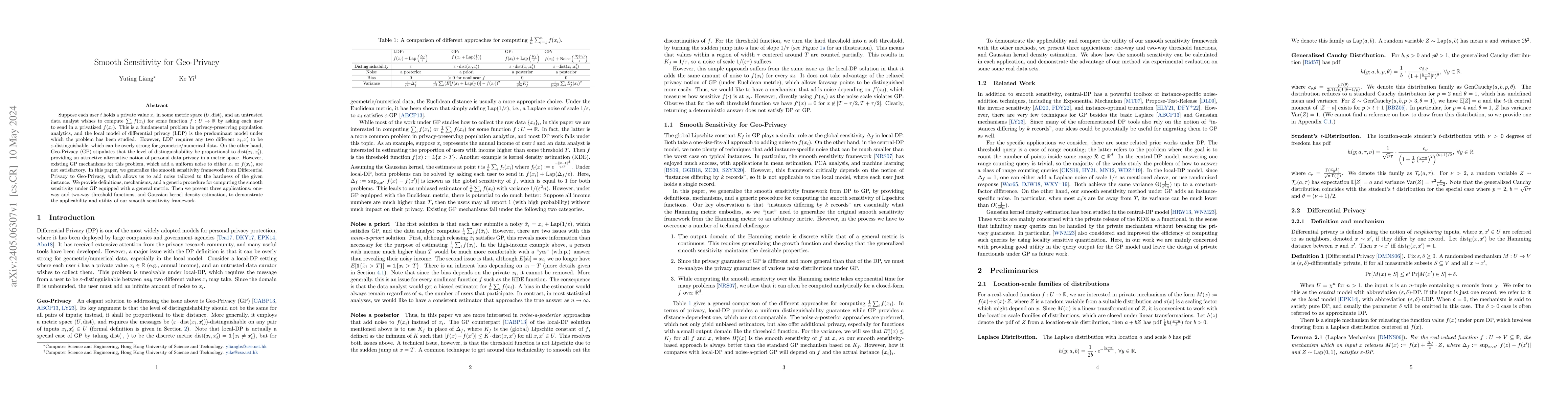 The paper introduces a smooth sensitivity framework for Geo-Privacy, generalizing the concept from Differential Privacy. It provides definitions, mechanisms, and a procedure for computing smooth sensitivity under Geo-Privacy with a general metric, and applies it to one-way and two-way threshold functions, as well as Gaussian kernel density estimation.