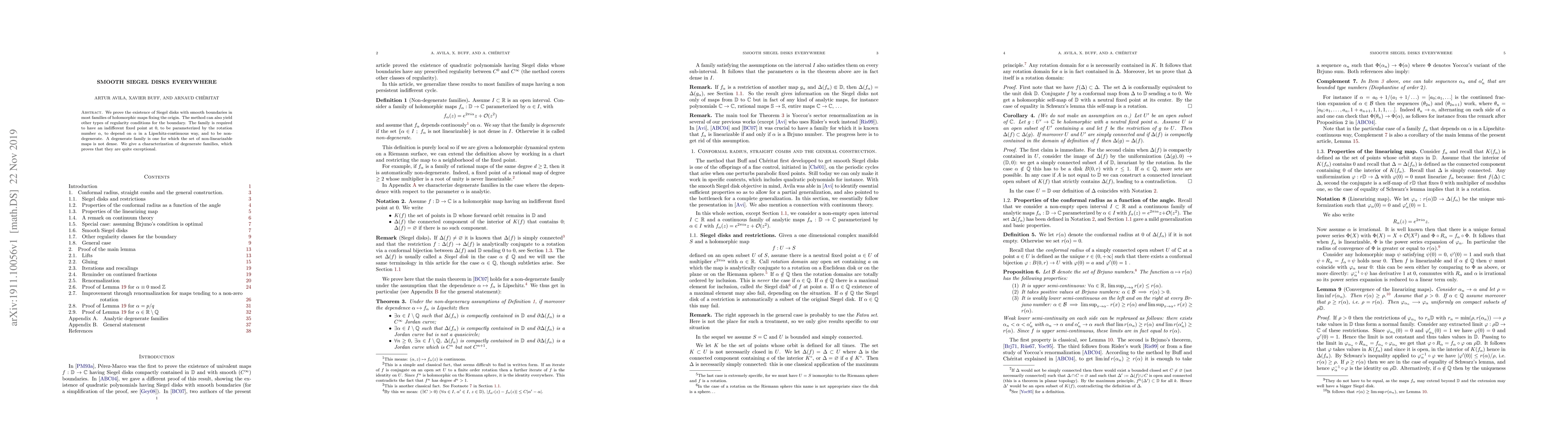 We prove the existence of Siegel disks with smooth boundaries in most families of holomorphic maps fixing the origin. The method can also yield other types of regularity conditions for the boundary. The family is required to have an indifferent fixed point at $0$, to be parameterized by the rotation number $\alpha$, to depend on $\alpha$ in a Lipschitz-continuous way, and to be non-degenerate. A degenerate family is one for which the set of non-linearizable maps is not dense. We give a characterization of degenerate families, which proves that they are quite exceptional.