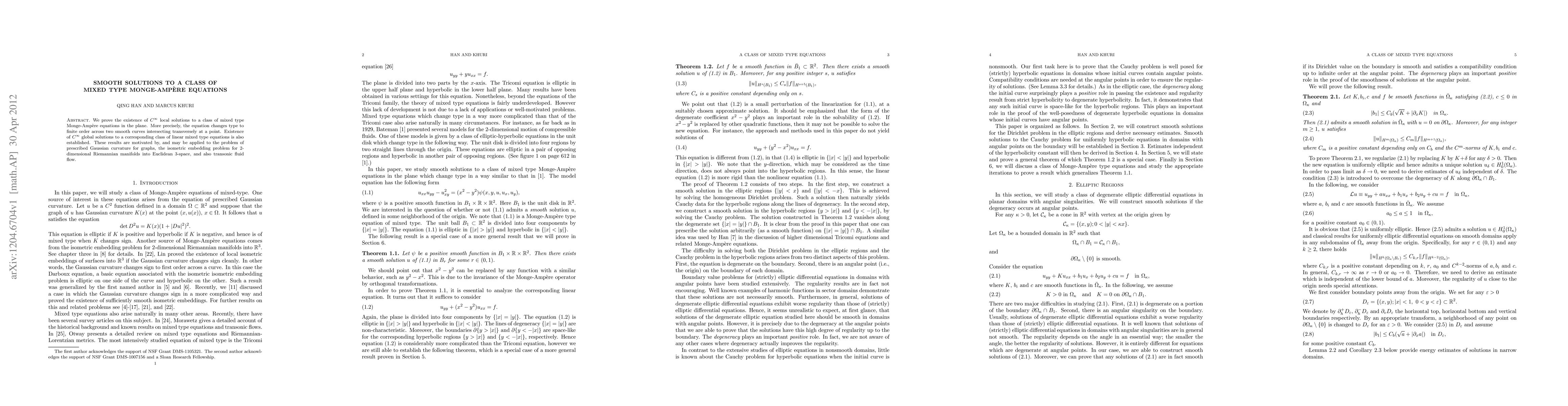 We prove the existence of C^{\infty} local solutions to a class of mixed type Monge-Ampere equations in the plane. More precisely, the equation changes type to finite order across two smooth curves intersecting transversely at a point. Existence of C^{\infty} global solutions to a corresponding class of linear mixed type equations is also established. These results are motivated by, and may be applied to the problem of prescribed Gaussian curvature for graphs, the isometric embedding problem for 2-dimensional Riemannian manifolds into Euclidean 3-space, and also transonic fluid flow.
