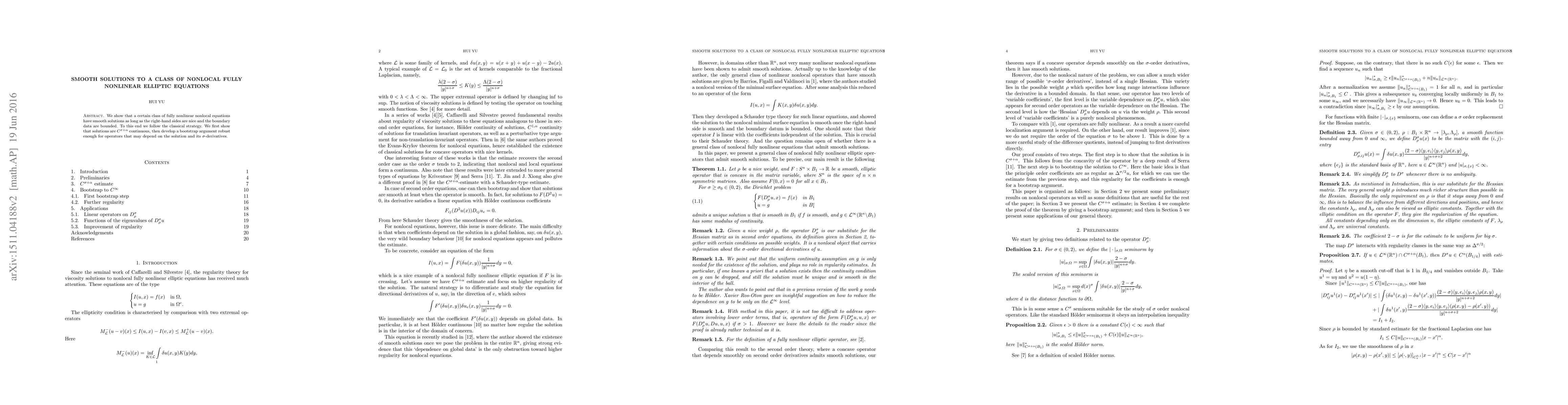 This paper demonstrates that smooth solutions exist for a class of fully nonlinear nonlocal elliptic equations provided that the right-hand side is well-behaved and the boundary conditions are bounded. The authors employ a classical strategy, proving $C^{\sigma+\alpha}$ continuity before using a robust bootstrap argument for operators dependent on the solution and its derivatives.