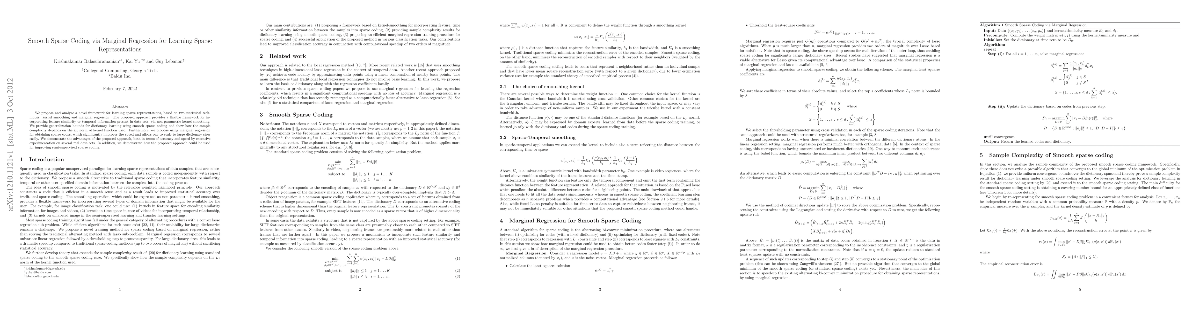 We propose and analyze a novel framework for learning sparse representations, based on two statistical techniques: kernel smoothing and marginal regression. The proposed approach provides a flexible framework for incorporating feature similarity or temporal information present in data sets, via non-parametric kernel smoothing. We provide generalization bounds for dictionary learning using smooth sparse coding and show how the sample complexity depends on the L1 norm of kernel function used. Furthermore, we propose using marginal regression for obtaining sparse codes, which significantly improves the speed and allows one to scale to large dictionary sizes easily. We demonstrate the advantages of the proposed approach, both in terms of accuracy and speed by extensive experimentation on several real data sets. In addition, we demonstrate how the proposed approach could be used for improving semi-supervised sparse coding.