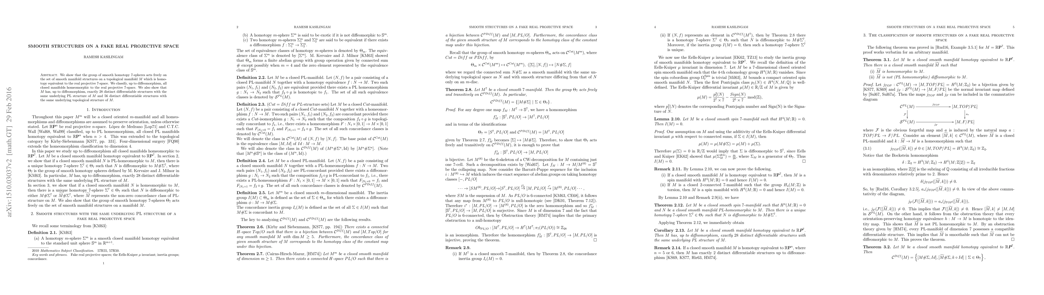 This paper demonstrates that the group of smooth homotopy $7$-spheres freely acts on the manifold structures of a topological space $M$ equivalent to real projective $7$-space. It classifies all closed manifolds homeomorphic to $M$ and finds $28$ distinct differentiable structures sharing $M$'s PL structure and $56$ sharing its topological structure.