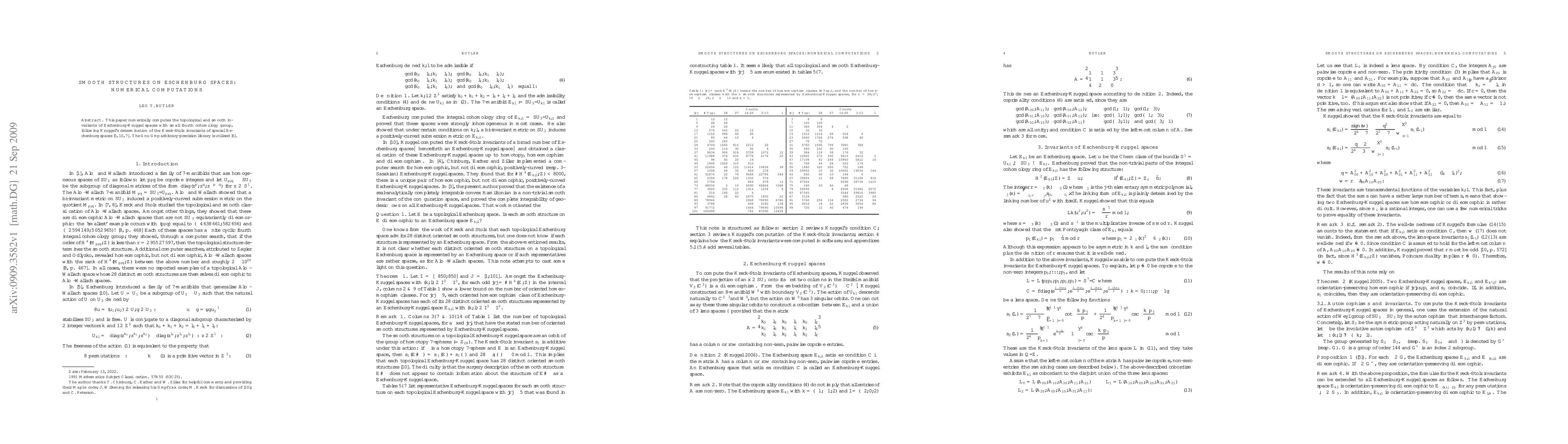 This paper numerically computes topological and smooth invariants of Eschenburg spaces using the GNU GMP library, building on Kruggel's work determining Kreck-Stolz invariants for spaces satisfying condition C. The results provide insights into the smooth structures of these spaces.