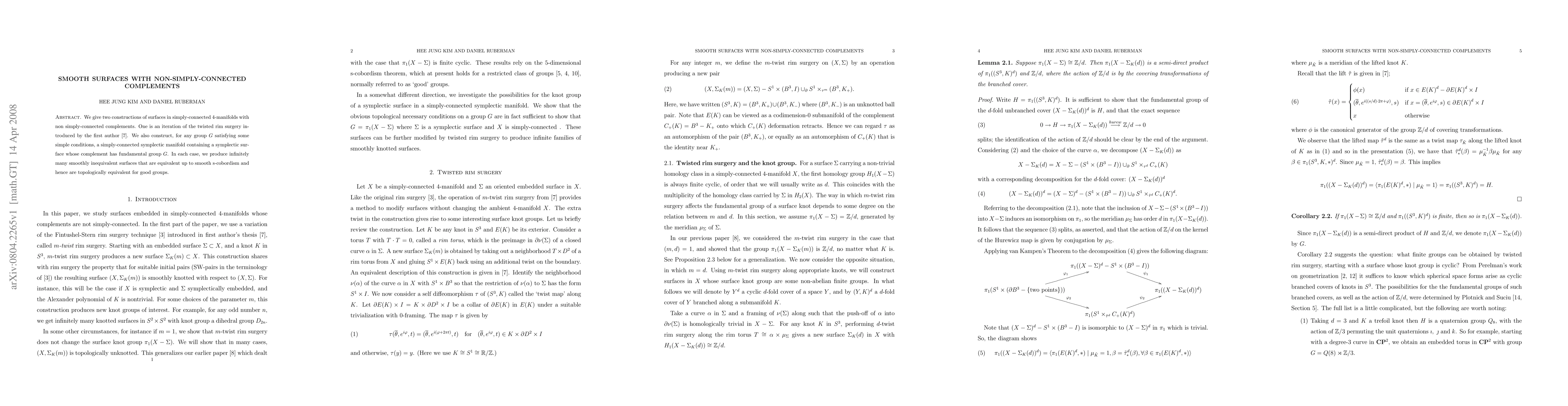 This paper presents two constructions of smooth surfaces in simply-connected 4-manifolds with non-simply-connected complements, including an iterative twisted rim surgery and a method for constructing symplectic surfaces with specified fundamental group complements. It demonstrates infinitely many smoothly inequivalent but topologically equivalent surfaces.