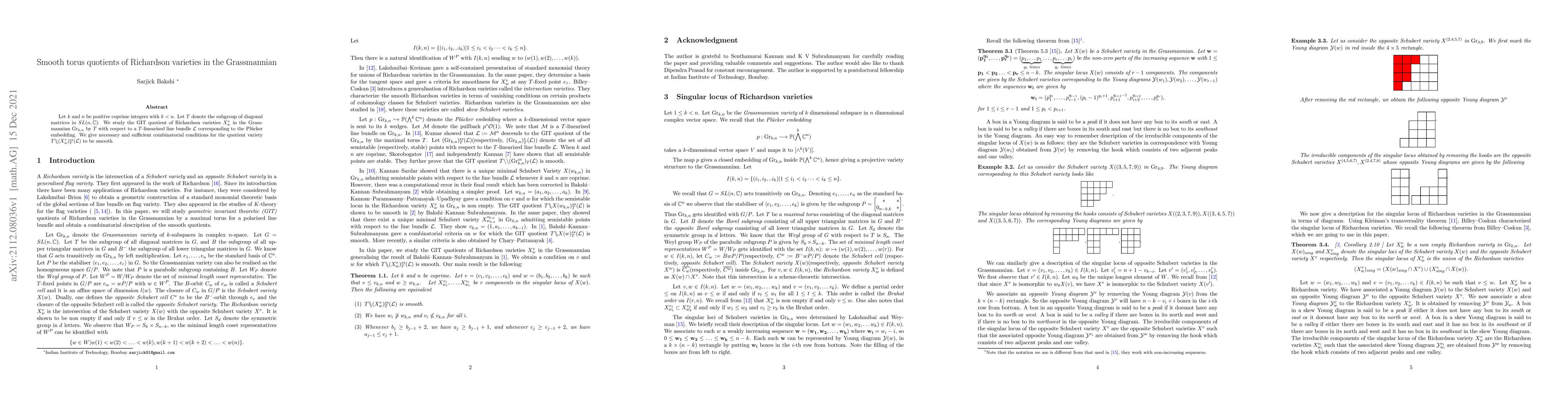 This paper investigates the GIT quotient of Richardson varieties in the Grassmannian by the subgroup $T$ of diagonal matrices in $SL(n,\mathbb{C})$, providing necessary and sufficient combinatorial conditions for the quotient variety to be smooth. The study focuses on the $T$-linearised line bundle corresponding to the Plücker embedding.