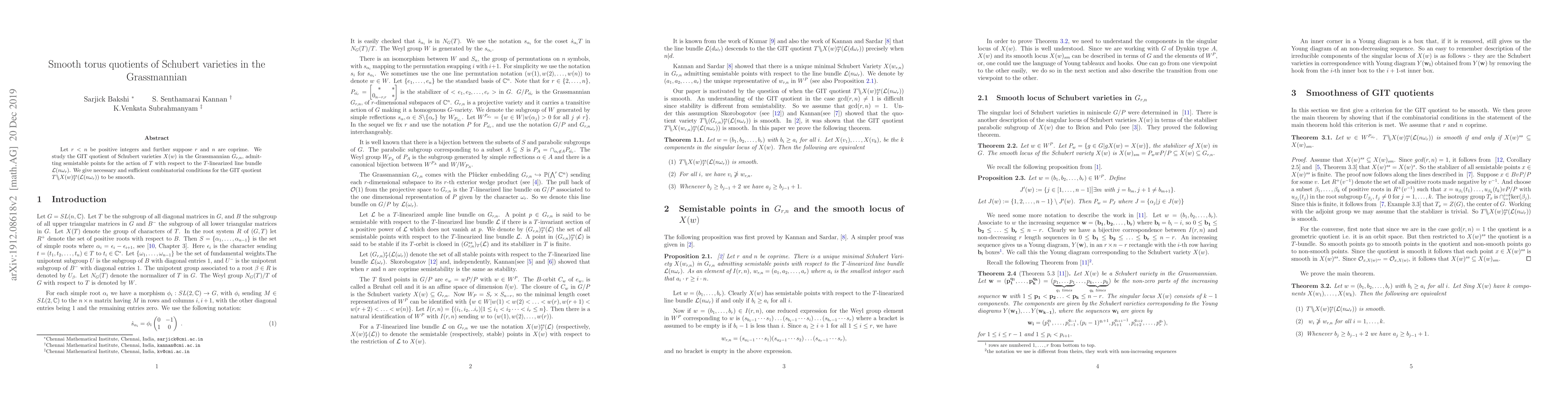 This paper investigates the GIT quotient of Schubert varieties in the Grassmannian $G_{r,n}$ under the action of $T$ with respect to a specific line bundle, providing necessary and sufficient combinatorial conditions for the quotient to be smooth when $r$ and $n$ are coprime. The study focuses on the semistable points of these Schubert varieties.