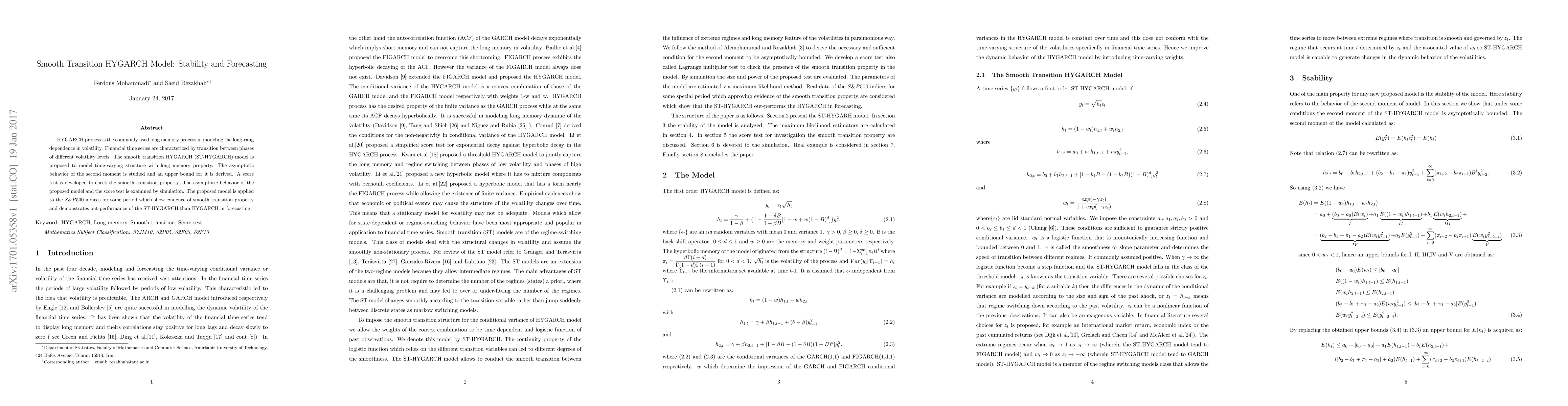 The paper proposes a smooth transition HYGARCH (ST-HYGARCH) model to capture time-varying volatility in financial time series with long memory. It demonstrates superior forecasting performance compared to the standard HYGARCH model when applied to the S&P500 indices.