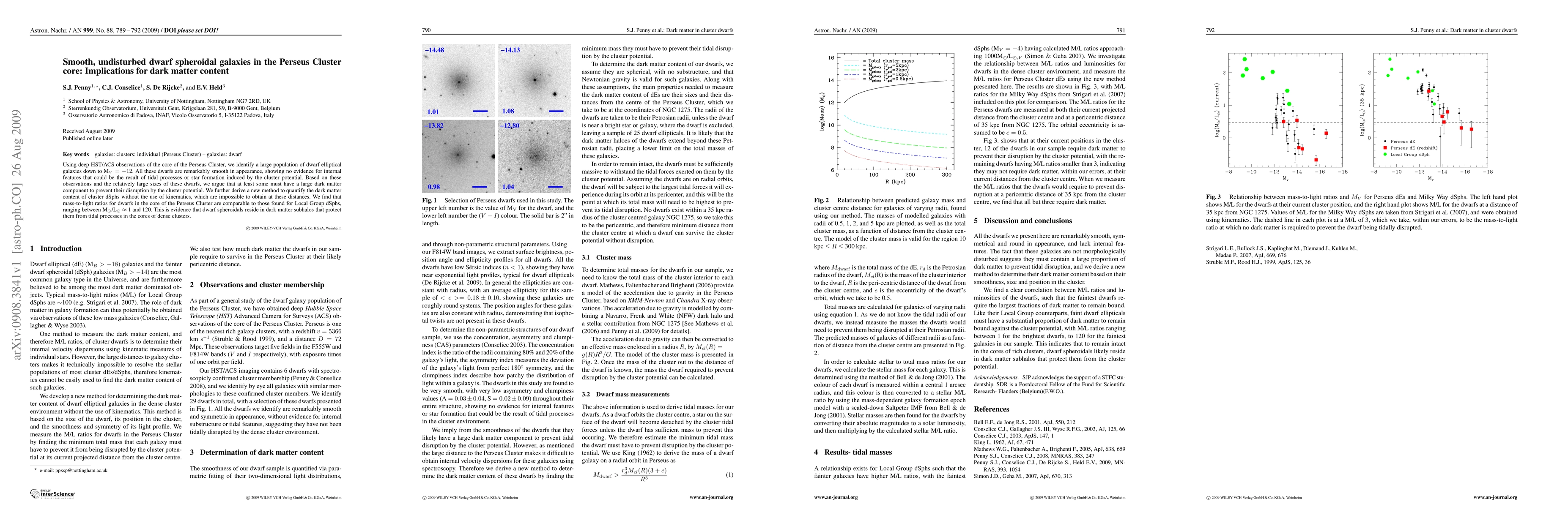 This paper identifies smooth dwarf elliptical galaxies in the Perseus Cluster core, suggesting they are largely undisturbed by tidal forces. The study proposes a new method to estimate dark matter content in these galaxies, finding that their mass-to-light ratios indicate significant dark matter presence, supporting the idea that they are protected by dark matter subhalos.