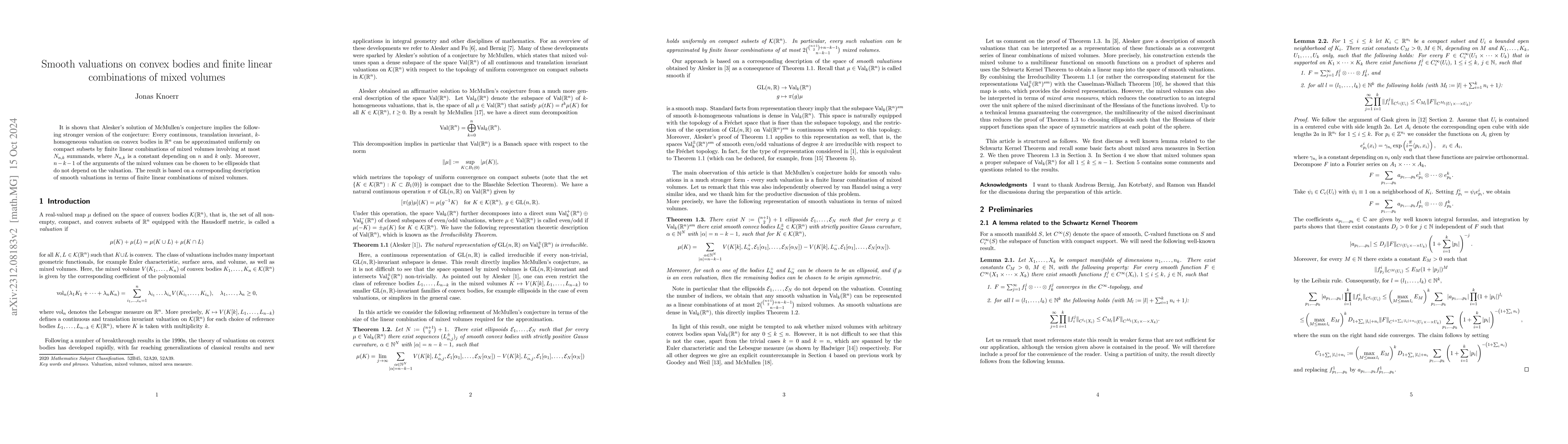 Summary: Alesker's proof of McMullen's conjecture demonstrates that any continuous, translation invariant, $k$-homogeneous valuation on convex bodies can be uniformly approximated by finite linear combinations of mixed volumes, with a fixed number of summands and $n-k-1$ of these volumes involving constant ellipsoids. This extends the original conjecture by providing a precise description of smooth valuations.