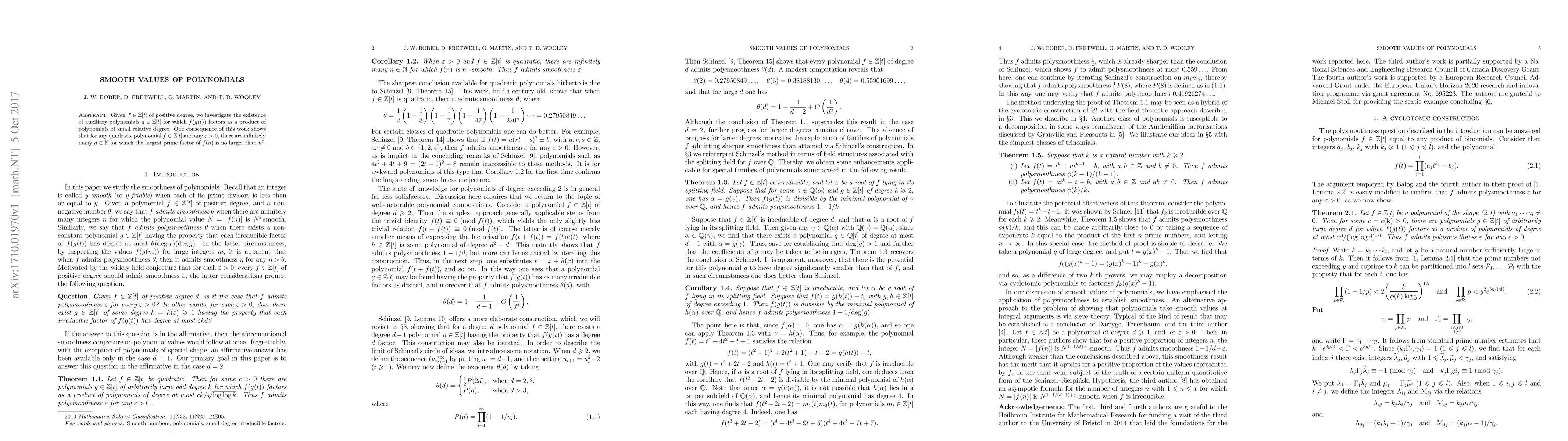 Given $f\in \mathbb{Z}[t]$ of positive degree, we investigate the existence of auxiliary polynomials $g\in \mathbb{Z}[t]$ for which $f(g(t))$ factors as a product of polynomials of small relative degree. One consequence of this work shows that for any quadratic polynomial $f\in\mathbb{Z}[t]$ and any $\epsilon > 0$, there are infinitely many $n\in\mathbb{N}$ for which the largest prime factor of $f(n)$ is no larger than $n^{\epsilon}$.