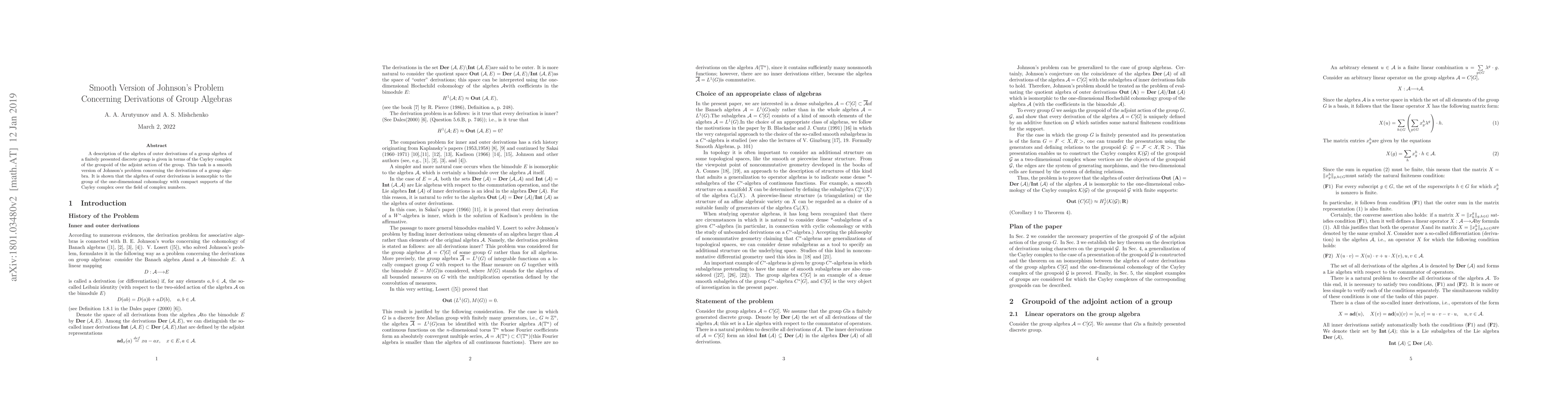 A description of the algebra of outer derivations of a group algebra of a finitely presented discrete group is given in terms of the Cayley complex of the groupoid of the adjoint action of the group. This task is a smooth version of Johnson's problem concerning the derivations of a group algebra. It is shown that the algebra of outer derivations is isomorphic to the group of the one-dimensional cohomology with compact supports of the Cayley complex over the field of complex numbers.