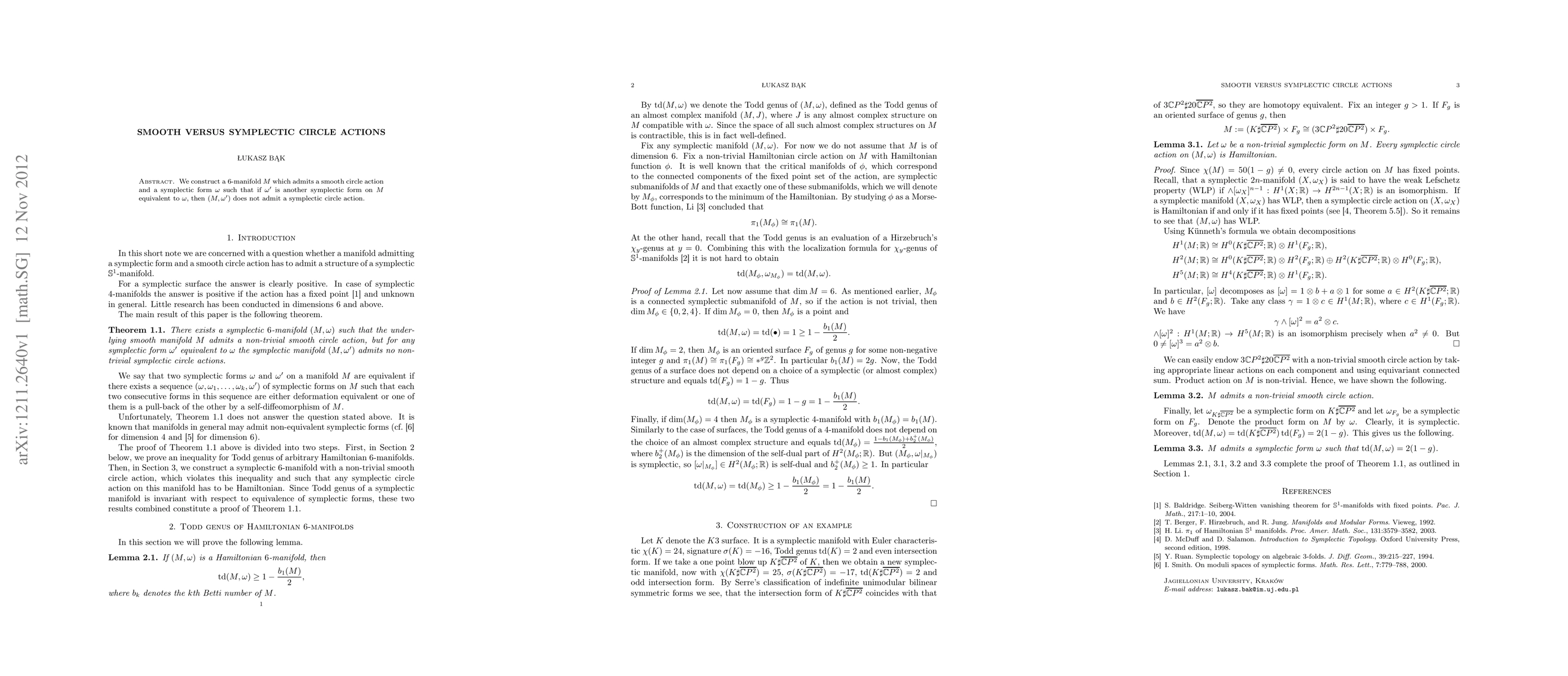 We construct a 6-manifold M which admits a smooth circle action and a symplectic form w such that if w' is another symplectic form on M equivalent to w, then (M,w') does not admit a symplectic circle action.