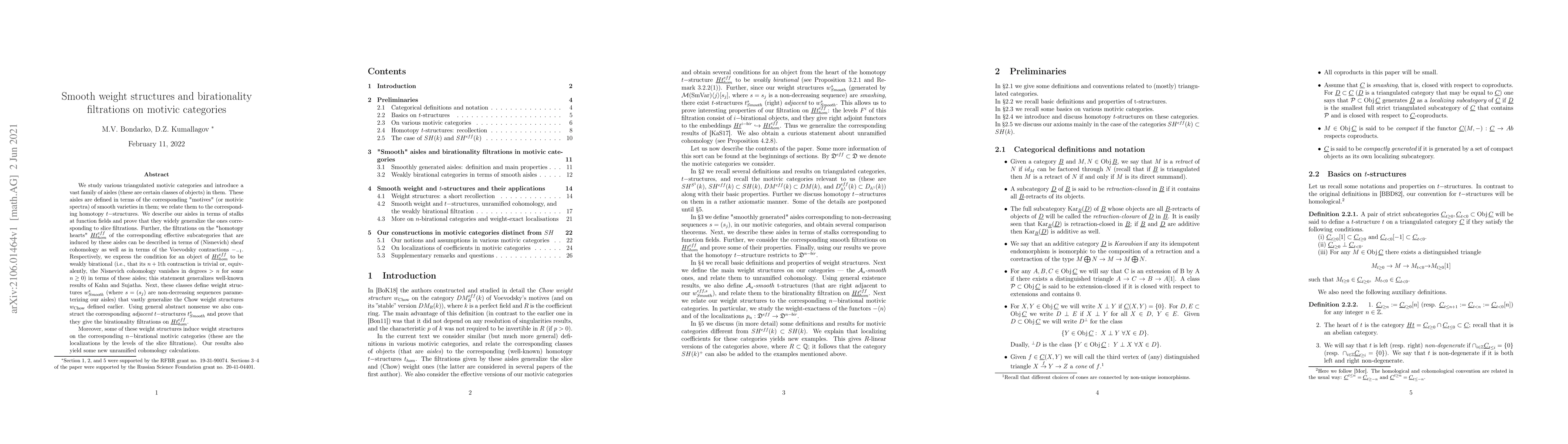 We study various triangulated motivic categories and introduce a vast family of aisles (these are certain classes of objects) in them. These aisles are defined in terms of the corresponding "motives" (or motivic spectra) of smooth varieties in them; we relate them to the corresponding homotopy t-structures. We describe our aisles in terms of stalks at function fields and prove that they widely generalize the ones corresponding to slice filtrations. Further, the filtrations on the "homotopy hearts" $Ht_{hom}^{eff}$ of the corresponding effective subcategories that are induced by these aisles can be described in terms of (Nisnevich) sheaf cohomology as well as in terms of the Voevodsky contractions $-_{-1}$. Respectively, we express the condition for an object of $Ht_{hom}^{eff}$ to be weakly birational (i.e., that its $n+1$th contraction is trivial or, equivalently, the Nisnevich cohomology vanishes in degrees $>n$ for some $n\ge 0$) in terms of these aisles; this statement generalizes well-known results of Kahn and Sujatha. Next, these classes define weight structures $w_{Smooth}^{s}$ (where $s=(s_{j})$ are non-decreasing sequences parameterizing our aisles) that vastly generalize the Chow weight structures $w_{Chow}$ defined earlier. Using general abstract nonsense we also construct the corresponding adjacent $t-$structures $t_{Smooth}^{s}$ and prove that they give the birationality filtrations on $Ht^{eff}_{hom}$. Moreover, some of these weight structures induce weight structures on the corresponding $n-$birational motivic categories (these are the localizations by the levels of the slice filtrations). Our results also yield some new unramified cohomology calculations.