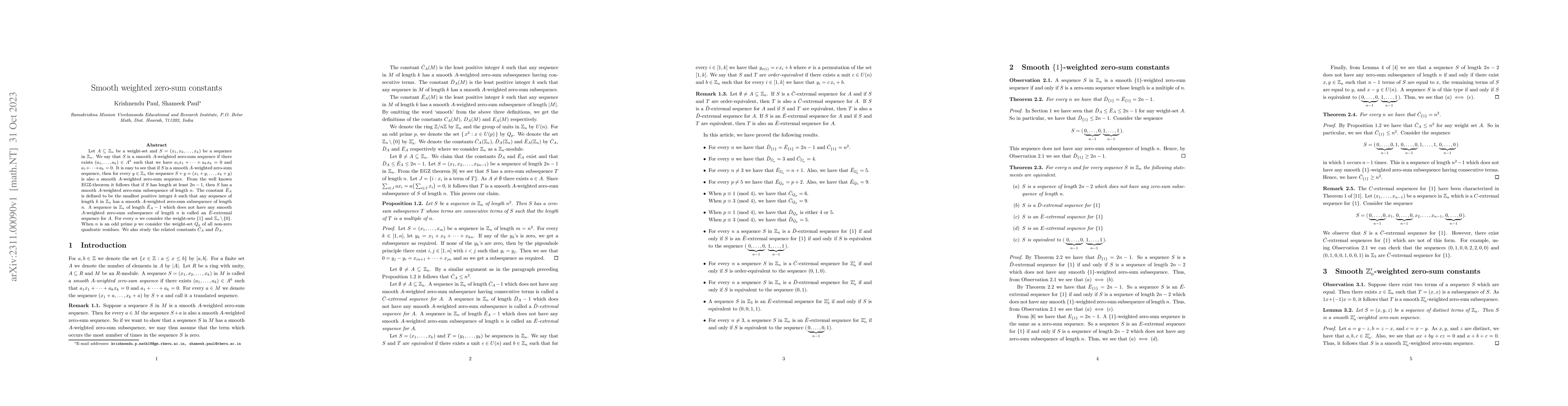 Let $A\subseteq\mathbb Z_n$ be a weight-set and $S=(x_1,x_2,\ldots, x_k)$ be a sequence in $\mathbb Z_n$. We say that $S$ is a smooth $A$-weighted zero-sum sequence if there exists $(a_1,\ldots,a_k)\in A^k$ such that we have $a_1x_1+\cdots+a_kx_k=0$ and $a_1+\cdots+a_k=0$. It is easy to see that if $S$ is a smooth $A$-weighted zero-sum sequence, then for every $y\in \mathbb Z_n$ the sequence $S+y=(x_1+y,\ldots,x_k+y)$ is also a smooth $A$-weighted zero-sum sequence. From the well known EGZ-theorem it follows that if $S$ has length at least $2n-1$, then $S$ has a smooth $A$-weighted zero-sum subsequence of length $n$. The constant $\bar E_A$ is defined to be the smallest positive integer $k$ such that any sequence of length $k$ in $\mathbb Z_n$ has a smooth $A$-weighted zero-sum subsequence of length $n$. A sequence in $\mathbb Z_n$ of length $\bar E_A-1$ which does not have any smooth $A$-weighted zero-sum subsequence of length $n$ is called an $\bar E$-extremal sequence for $A$. For every $n$ we consider the weight-sets $\{1\}$ and $\mathbb Z_n\setminus\{0\}$. When $n$ is an odd prime $p$ we consider the weight-set $Q_p$ of all non-zero quadratic residues. We also study the related constants $\bar C_A$ and $\bar D_A$.