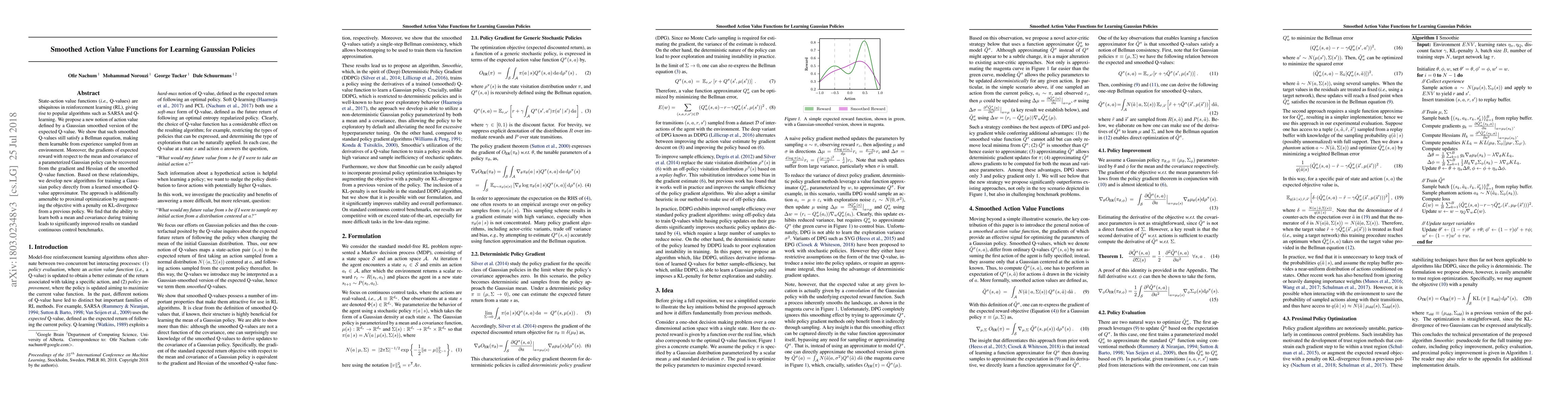 This paper introduces smoothed action value functions based on Gaussian-smoothed Q-values, which maintain a Bellman equation and enable gradient-based learning of Gaussian policies. The proposed approach shows improved performance on continuous control tasks by learning both the mean and covariance of the policy.