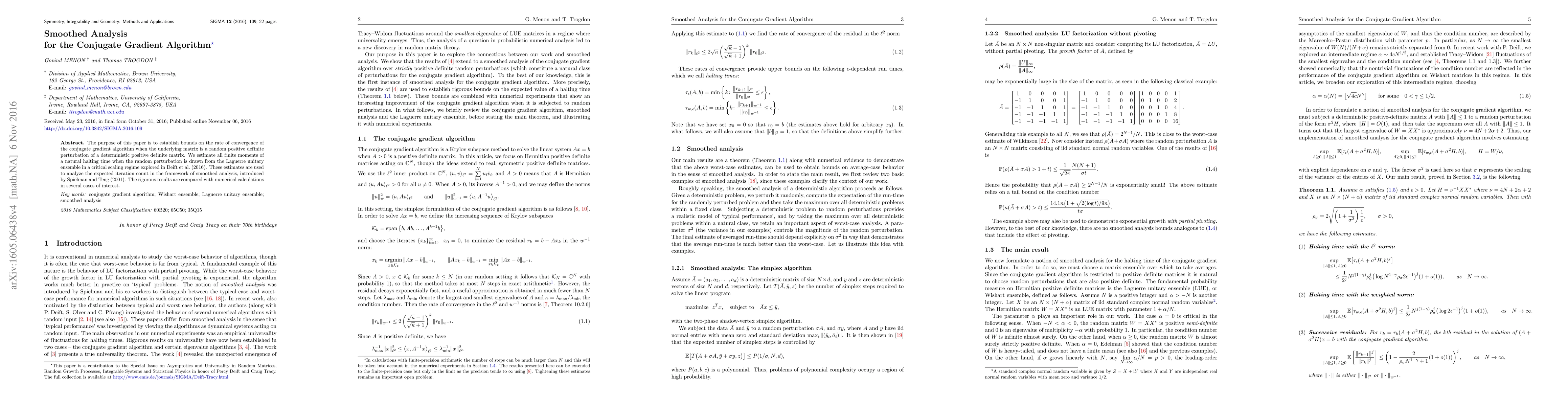 This paper explores the convergence rate of the conjugate gradient algorithm under random perturbations, estimating finite moments of halting time and analyzing expected iteration count in smoothed analysis. Numerical results are compared to theoretical findings.