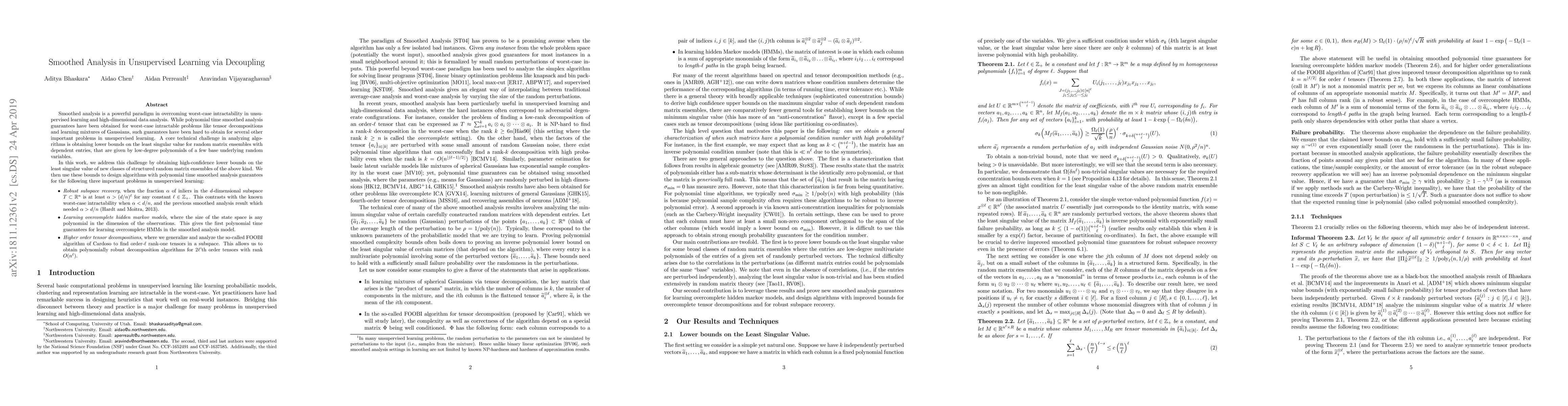 This paper introduces smoothed analysis techniques to tackle worst-case intractability in unsupervised learning, providing polynomial time guarantees for robust subspace recovery, learning overcomplete hidden Markov models, and higher order tensor decompositions by obtaining high-confidence lower bounds on the least singular value of structured random matrix ensembles.