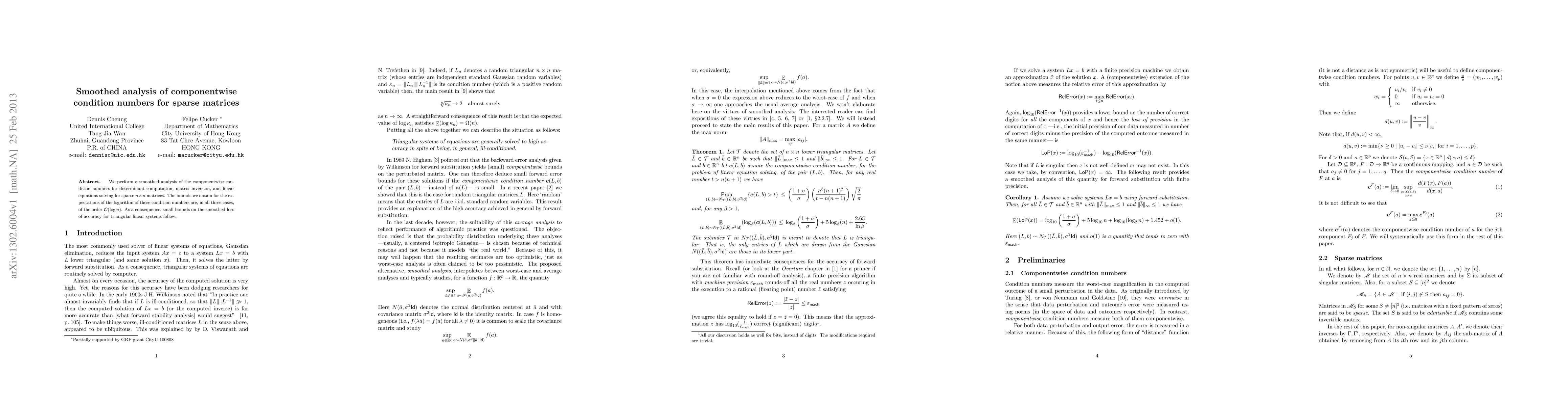 This paper conducts a smoothed analysis of componentwise condition numbers for determinant computation, matrix inversion, and linear equations solving in sparse matrices, finding that the expected logarithms of these condition numbers are O(log n), leading to small bounds on the smoothed loss of accuracy for triangular linear systems.