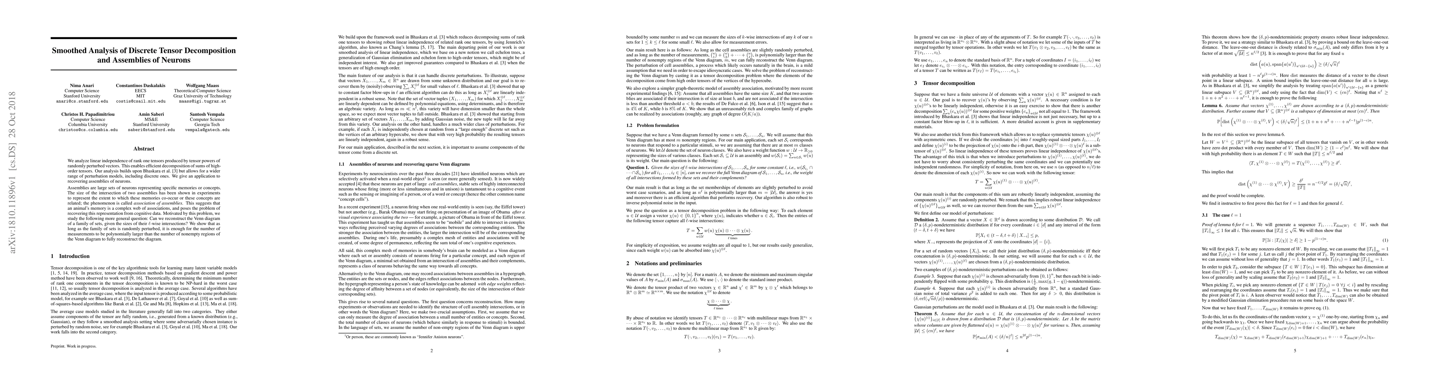 We analyze linear independence of rank one tensors produced by tensor powers of randomly perturbed vectors. This enables efficient decomposition of sums of high-order tensors. Our analysis builds upon [BCMV14] but allows for a wider range of perturbation models, including discrete ones. We give an application to recovering assemblies of neurons. Assemblies are large sets of neurons representing specific memories or concepts. The size of the intersection of two assemblies has been shown in experiments to represent the extent to which these memories co-occur or these concepts are related; the phenomenon is called association of assemblies. This suggests that an animal's memory is a complex web of associations, and poses the problem of recovering this representation from cognitive data. Motivated by this problem, we study the following more general question: Can we reconstruct the Venn diagram of a family of sets, given the sizes of their $\ell$-wise intersections? We show that as long as the family of sets is randomly perturbed, it is enough for the number of measurements to be polynomially larger than the number of nonempty regions of the Venn diagram to fully reconstruct the diagram.