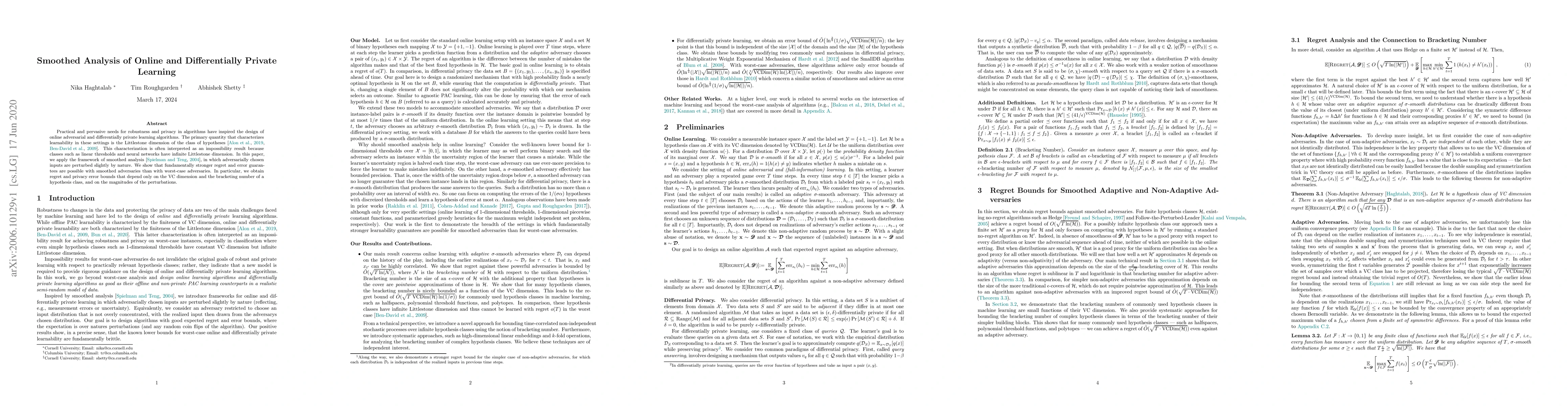 This paper applies smoothed analysis to online and differentially private learning algorithms, demonstrating that under slight perturbations to adversarial inputs, stronger regret and error guarantees can be achieved compared to worst-case scenarios. The study leverages the VC dimension and bracketing number to provide improved bounds.