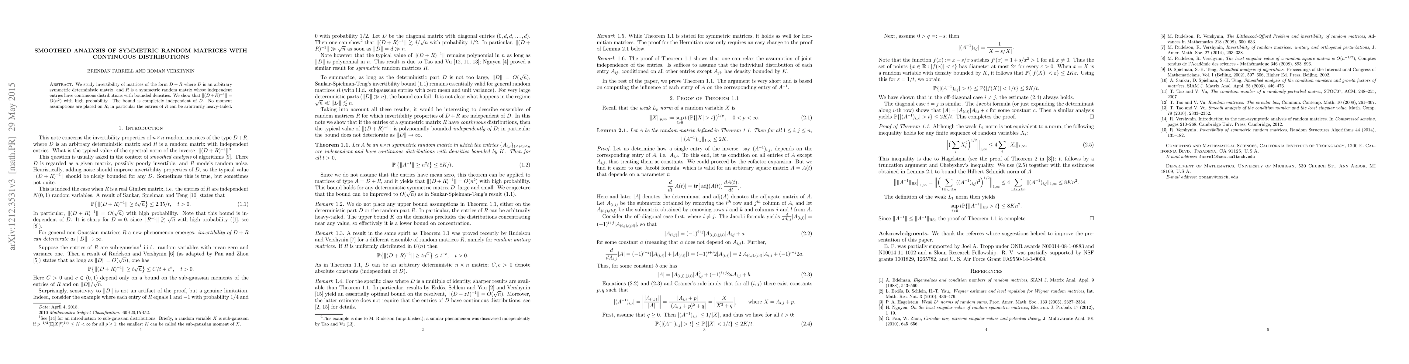 Researchers studied matrices of the form D+R, where D is fixed and R is a random symmetric matrix with continuous distributions. They found that the inverse of such matrices has an error bound of O(n^2) with high probability.