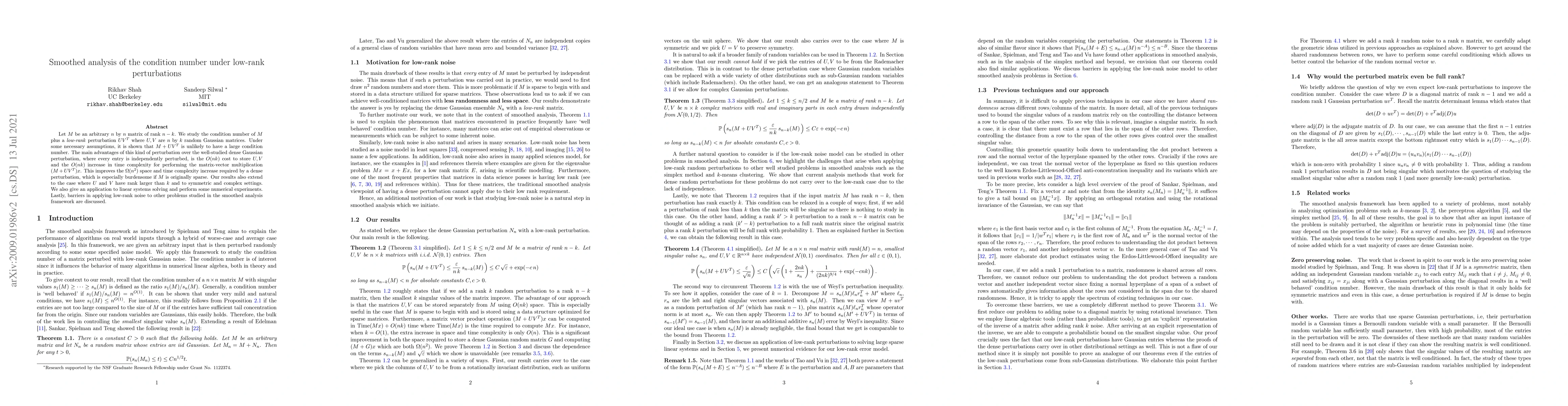 Let $M$ be an arbitrary $n$ by $n$ matrix of rank $n-k$. We study the condition number of $M$ plus a \emph{low-rank} perturbation $UV^T$ where $U, V$ are $n$ by $k$ random Gaussian matrices. Under some necessary assumptions, it is shown that $M+UV^T$ is unlikely to have a large condition number. The main advantages of this kind of perturbation over the well-studied dense Gaussian perturbation, where every entry is independently perturbed, is the $O(nk)$ cost to store $U,V$ and the $O(nk)$ increase in time complexity for performing the matrix-vector multiplication $(M+UV^T)x$. This improves the $\Omega(n^2)$ space and time complexity increase required by a dense perturbation, which is especially burdensome if $M$ is originally sparse. Our results also extend to the case where $U$ and $V$ have rank larger than $k$ and to symmetric and complex settings. We also give an application to linear systems solving and perform some numerical experiments. Lastly, barriers in applying low-rank noise to other problems studied in the smoothed analysis framework are discussed.