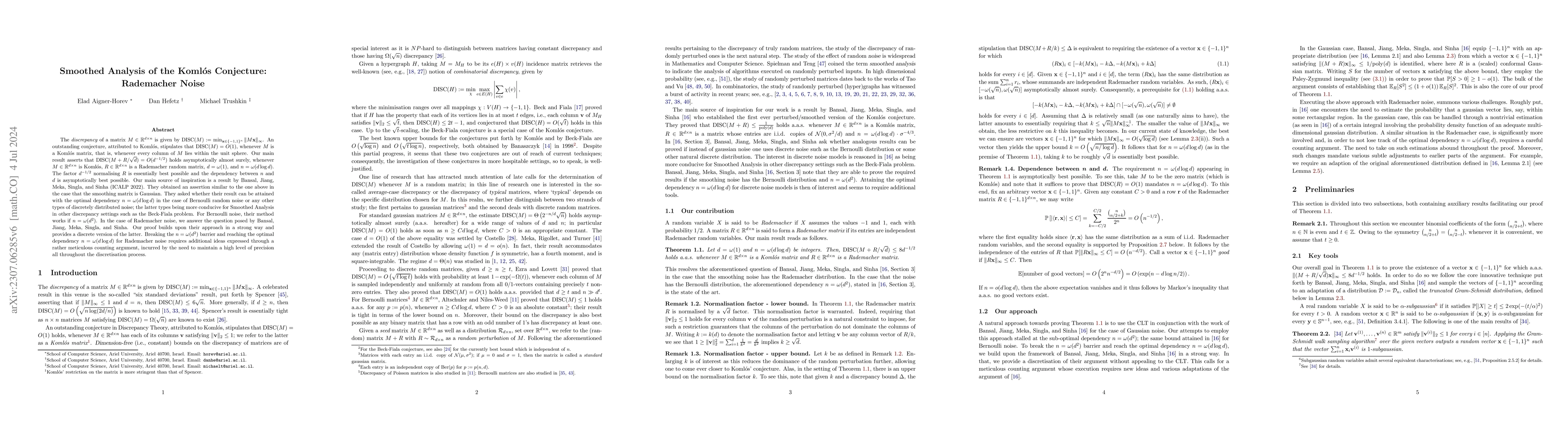 The {\em discrepancy} of a matrix $M \in \mathbb{R}^{d \times n}$ is given by $\mathrm{DISC}(M) := \min_{\boldsymbol{x} \in \{-1,1\}^n} \|M\boldsymbol{x}\|_\infty$. An outstanding conjecture, attributed to Koml\'os, stipulates that $\mathrm{DISC}(M) = O(1)$, whenever $M$ is a Koml\'os matrix, that is, whenever every column of $M$ lies within the unit sphere. Our main result asserts that $\mathrm{DISC}(M + R/\sqrt{d}) = O(d^{-1/2})$ holds asymptotically almost surely, whenever $M \in \mathbb{R}^{d \times n}$ is Koml\'os, $R \in \mathbb{R}^{d \times n}$ is a Rademacher random matrix, $d = \omega(1)$, and $n = \omega(d \log d)$. The factor $d^{-1/2}$ normalising $R$ is essentially best possible and the dependency between $n$ and $d$ is asymptotically best possible. Our main source of inspiration is a result by Bansal, Jiang, Meka, Singla, and Sinha (ICALP 2022). They obtained an assertion similar to the one above in the case that the smoothing matrix is Gaussian. They asked whether their result can be attained with the optimal dependency $n = \omega(d \log d)$ in the case of Bernoulli random noise or any other types of discretely distributed noise; the latter types being more conducive for Smoothed Analysis in other discrepancy settings such as the Beck-Fiala problem. For Bernoulli noise, their method works if $n = \omega(d^2)$. In the case of Rademacher noise, we answer the question posed by Bansal, Jiang, Meka, Singla, and Sinha. Our proof builds upon their approach in a strong way and provides a discrete version of the latter. Breaking the $n = \omega(d^2)$ barrier and reaching the optimal dependency $n = \omega(d \log d)$ for Rademacher noise requires additional ideas expressed through a rather meticulous counting argument, incurred by the need to maintain a high level of precision all throughout the discretisation process.