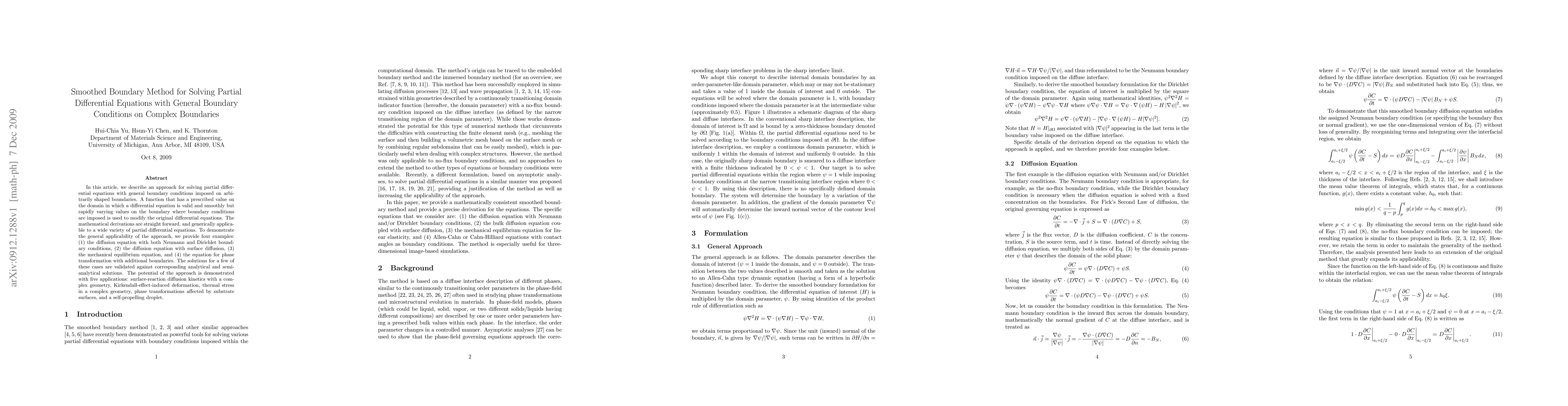 In this article, we describe an approach for solving partial differential equations with general boundary conditions imposed on arbitrarily shaped boundaries. A function that has a prescribed value on the domain in which a differential equation is valid and smoothly but rapidly varying values on the boundary where boundary conditions are imposed is used to modify the original differential equations. The mathematical derivations are straight forward, and generically applicable to a wide variety of partial differential equations. To demonstrate the general applicability of the approach, we provide four examples: (1) the diffusion equation with both Neumann and Dirichlet boundary conditions, (2) the diffusion equation with surface diffusion, (3) the mechanical equilibrium equation, and (4) the equation for phase transformation with additional boundaries. The solutions for a few of these cases are validated against corresponding analytical and semi-analytical solutions. The potential of the approach is demonstrated with five applications: surface-reaction diffusion kinetics with a complex geometry, Kirkendall-effect-induced deformation, thermal stress in a complex geometry, phase transformations affected by substrate surfaces, and a self-propelling droplet.