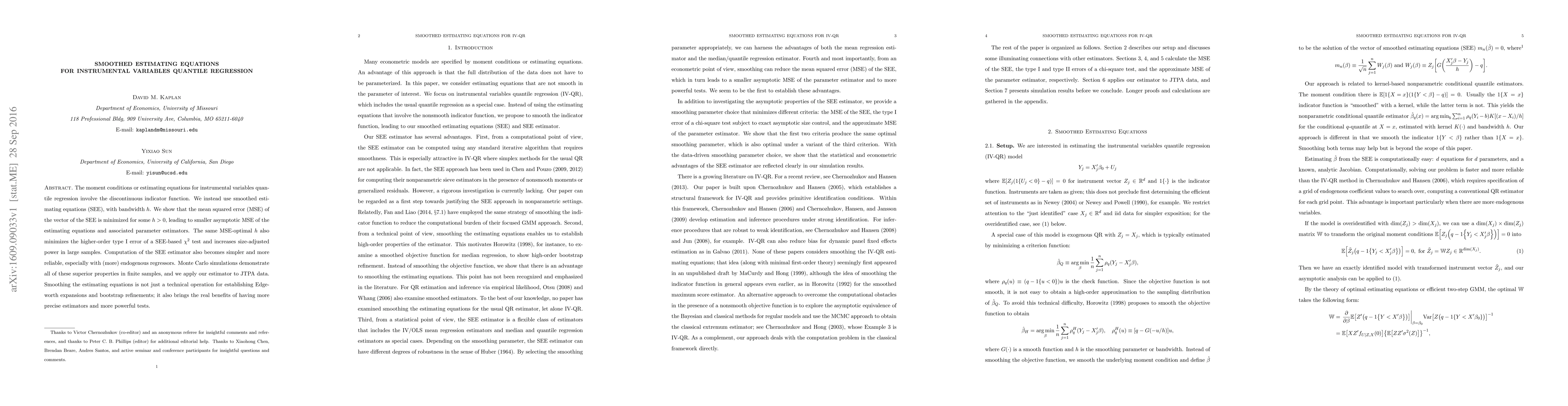 This paper proposes smoothed estimating equations (SEE) for instrumental variables quantile regression, demonstrating that optimal bandwidth $h$ minimizes mean squared error and improves the power of $\chi^2$ tests. Monte Carlo simulations show enhanced precision and reliability, especially with endogenous regressors.