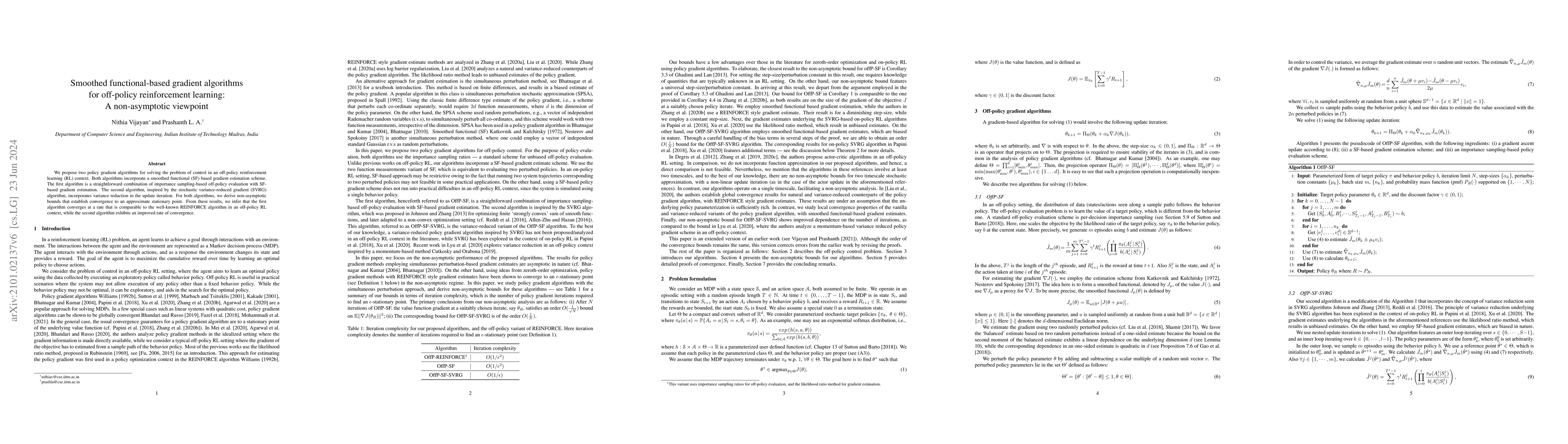 This paper proposes two novel policy gradient algorithms for off-policy reinforcement learning, incorporating smoothed functional-based gradient estimation. The first algorithm combines importance sampling with SF-based gradient estimation, while the second, inspired by SVRG, includes variance reduction. Both algorithms achieve convergence to an approximate stationary point, with the second showing an improved convergence rate.