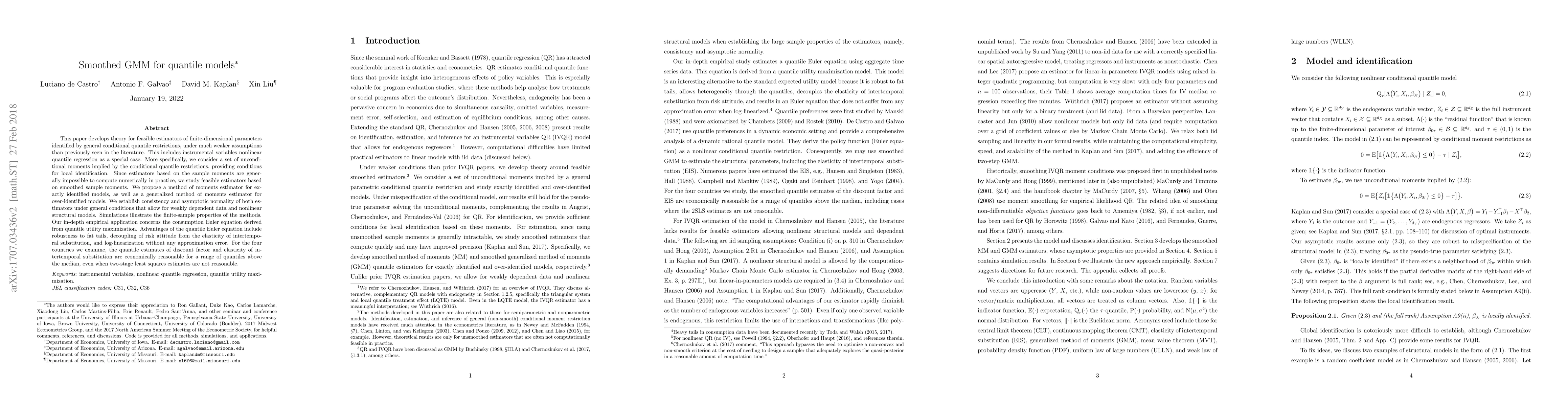 This paper proposes smoothed GMM estimators for quantile models under weaker assumptions, establishing consistency and asymptotic normality. It applies these methods to the consumption Euler equation, showing robustness and reasonable estimates for discount factors and intertemporal substitution across various quantiles.