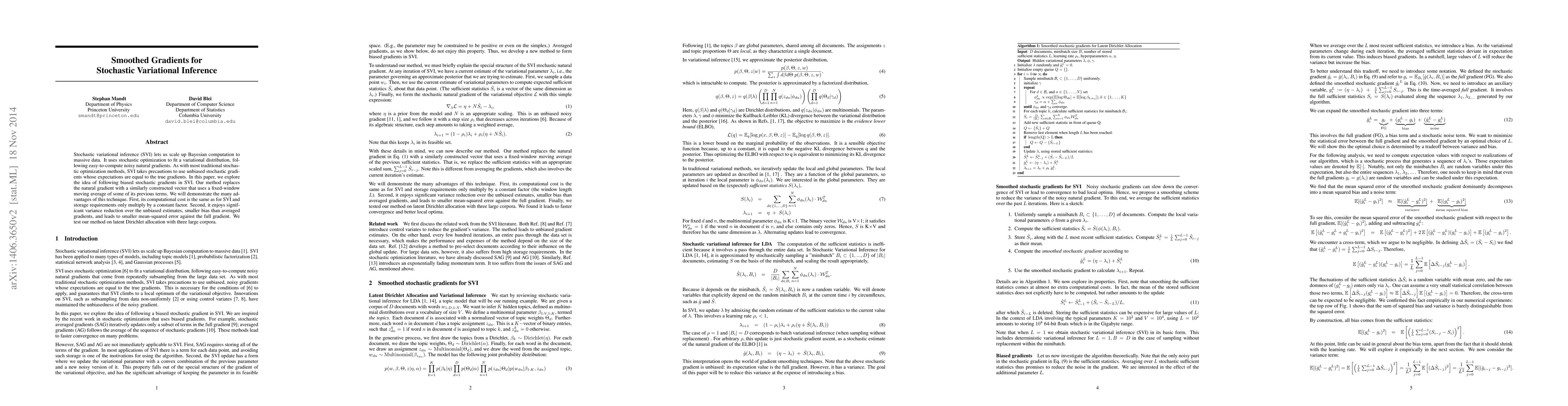This paper proposes smoothed gradients for stochastic variational inference (SVI), replacing natural gradients with a fixed-window moving average of previous terms. The method maintains the same computational cost as traditional SVI while achieving significant variance reduction, smaller bias, and lower mean-squared error, demonstrated through experiments on latent Dirichlet allocation with large datasets.