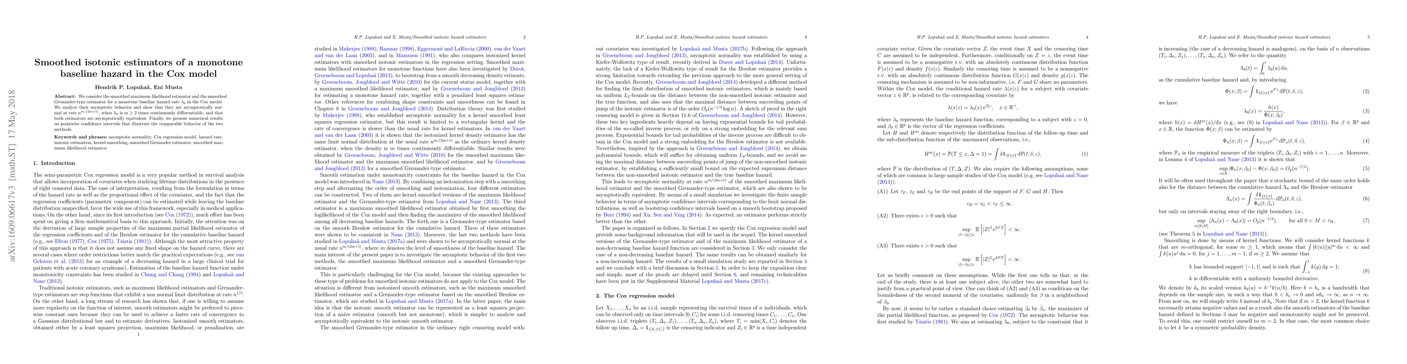 This paper investigates smoothed estimators for a monotone baseline hazard in the Cox model, demonstrating their asymptotic normality and equivalence, and presenting numerical results on confidence intervals to illustrate their comparable performance.