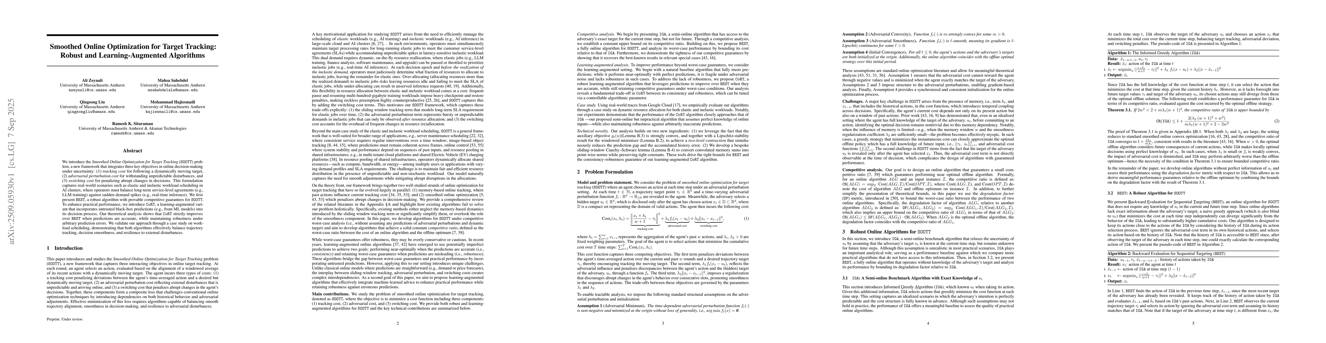 We introduce the Smoothed Online Optimization for Target Tracking (SOOTT) problem, a new framework that integrates three key objectives in online decision-making under uncertainty: (1) tracking cost for following a dynamically moving target, (2) adversarial perturbation cost for withstanding unpredictable disturbances, and (3) switching cost for penalizing abrupt changes in decisions. This formulation captures real-world scenarios such as elastic and inelastic workload scheduling in AI clusters, where operators must balance long-term service-level agreements (e.g., LLM training) against sudden demand spikes (e.g., real-time inference). We first present BEST, a robust algorithm with provable competitive guarantees for SOOTT. To enhance practical performance, we introduce CoRT, a learning-augmented variant that incorporates untrusted black-box predictions (e.g., from ML models) into its decision process. Our theoretical analysis shows that CoRT strictly improves over BEST when predictions are accurate, while maintaining robustness under arbitrary prediction errors. We validate our approach through a case study on workload scheduling, demonstrating that both algorithms effectively balance trajectory tracking, decision smoothness, and resilience to external disturbances.