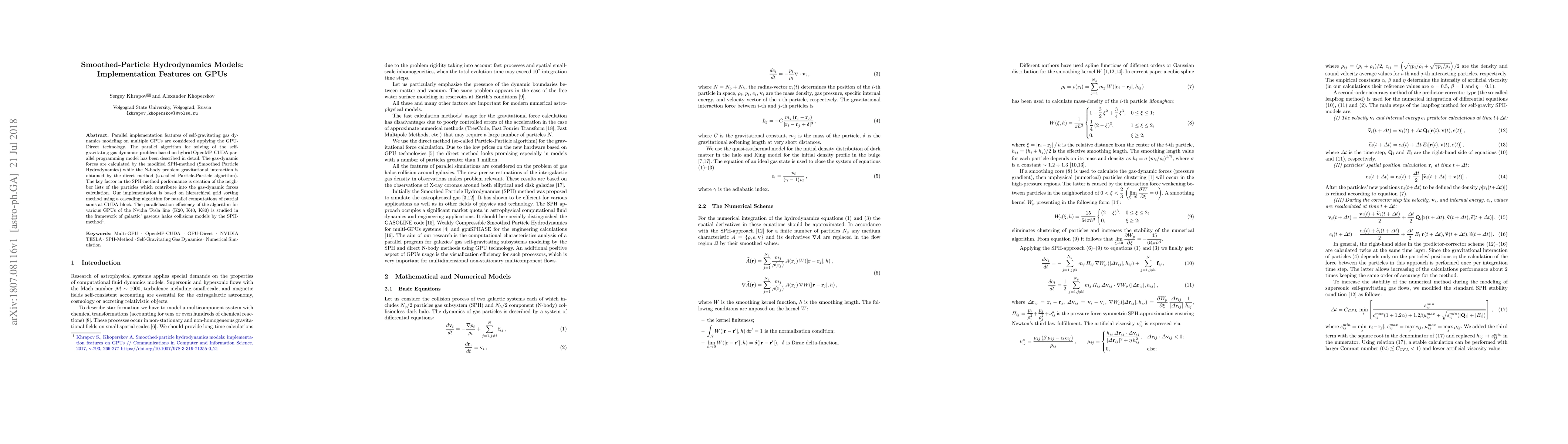 The paper presents a detailed parallel algorithm for self-gravitating gas dynamics modeling on GPUs, incorporating GPU-Direct technology and a hybrid OpenMP-CUDA programming model, which significantly improves computational performance for astrophysical SPH simulations.
