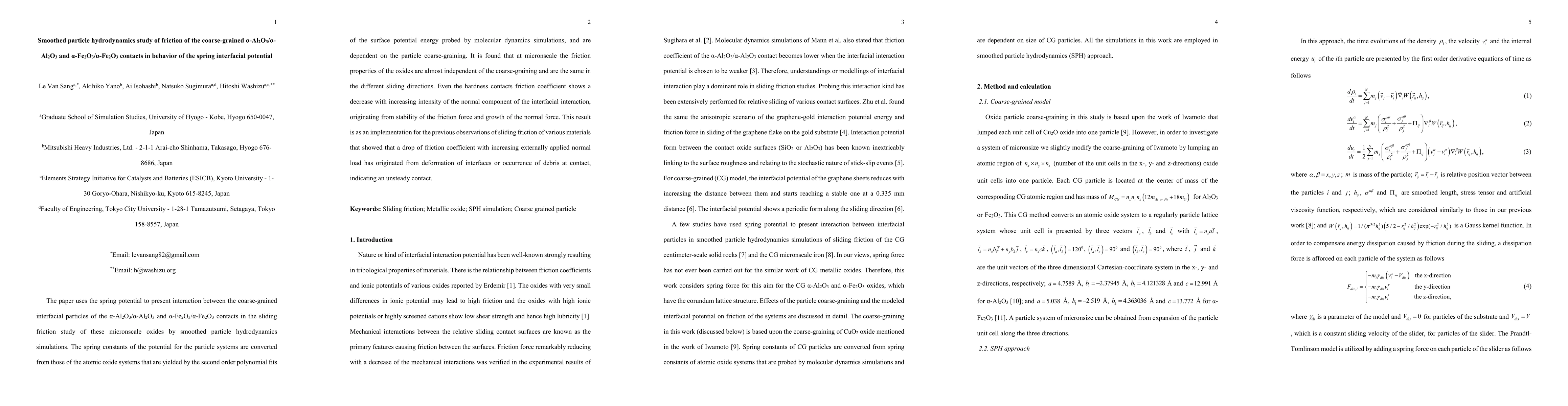 The paper uses the spring potential to present interaction between the coarse-grained interfacial particles of the $\alpha$-Al2O3/$\alpha$-Al2O3 and $\alpha$-Fe2O3/$\alpha$-Fe2O3 contacts in the sliding friction study of these micron-scale oxides by smoothed particle hydrodynamics simulations. The spring constants of the potential for the particle systems are converted from those of the atomic oxide systems that are yielded by the second order polynomial fits of the probed surface potentials in molecular dynamics simulations, and are dependent on the particle coarse-graining. It is founded that at micron-scale the friction properties of the oxides are almost independent of the coarse-graining and are the same in the different sliding directions. Even the hardness contacts friction coefficient shows a decrease with increasing intensity of normal component of the interfacial interaction, originating from stability of friction force and growth of normal force. This result is as an implementation for the previous observations of sliding friction of various materials that showed that a drop of friction coefficient with increasing externally applied normal load has originated from deformation of interfaces or occurrence of debris at contact, indicating an unsteady contact.