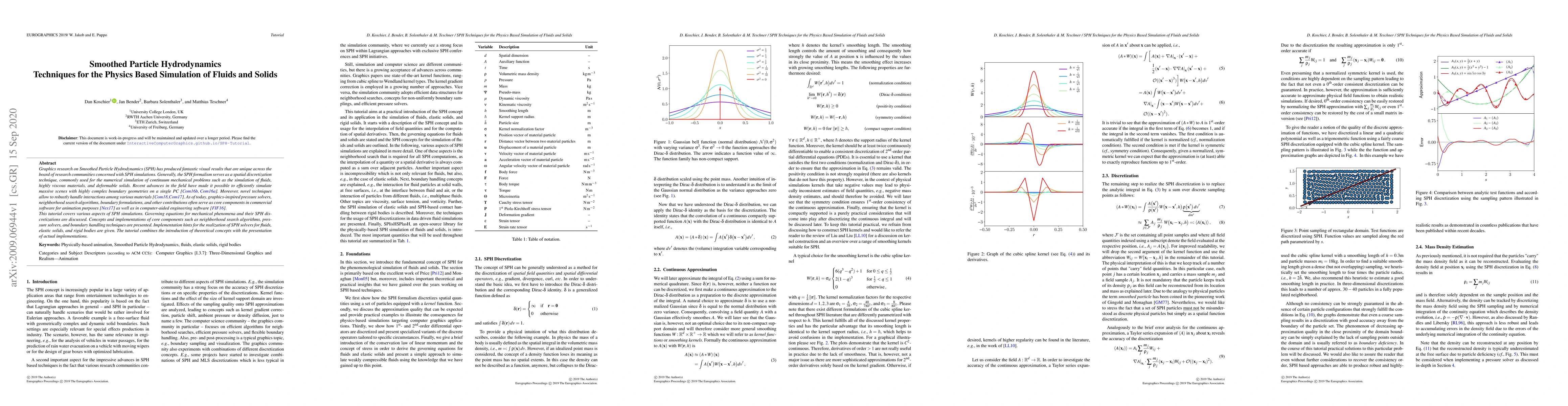 Graphics research on Smoothed Particle Hydrodynamics (SPH) has produced fantastic visual results that are unique across the board of research communities concerned with SPH simulations. Generally, the SPH formalism serves as a spatial discretization technique, commonly used for the numerical simulation of continuum mechanical problems such as the simulation of fluids, highly viscous materials, and deformable solids. Recent advances in the field have made it possible to efficiently simulate massive scenes with highly complex boundary geometries on a single PC [Com16b, Com16a]. Moreover, novel techniques allow to robustly handle interactions among various materials [Com18,Com17]. As of today, graphics-inspired pressure solvers, neighborhood search algorithms, boundary formulations, and other contributions often serve as core components in commercial software for animation purposes [Nex17] as well as in computer-aided engineering software [FIF16]. This tutorial covers various aspects of SPH simulations. Governing equations for mechanical phenomena and their SPH discretizations are discussed. Concepts and implementations of core components such as neighborhood search algorithms, pressure solvers, and boundary handling techniques are presented. Implementation hints for the realization of SPH solvers for fluids, elastic solids, and rigid bodies are given. The tutorial combines the introduction of theoretical concepts with the presentation of actual implementations.