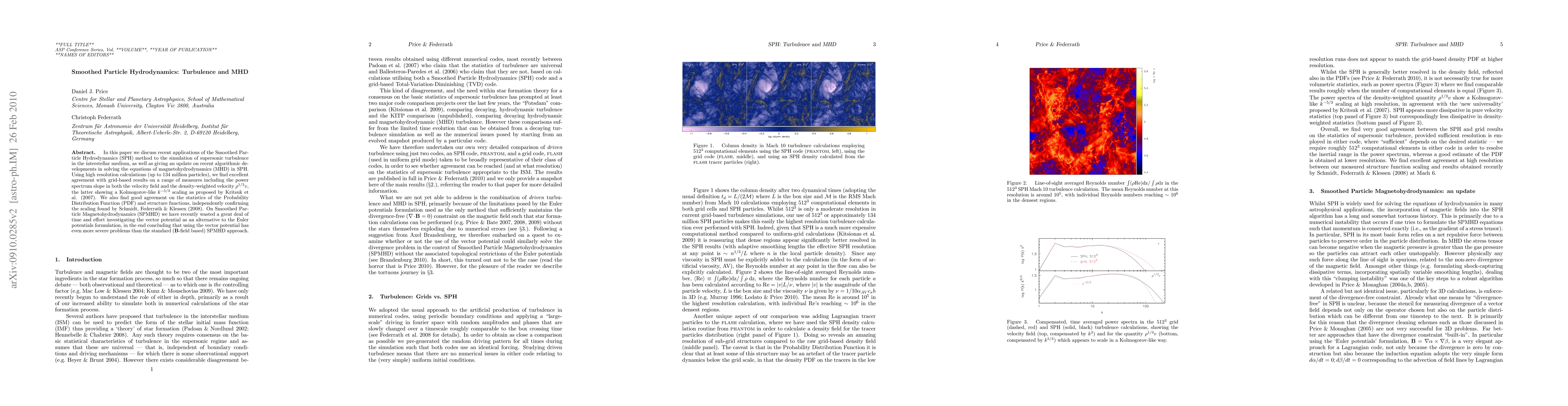 In this paper we discuss recent applications of the Smoothed Particle Hydrodynamics (SPH) method to the simulation of supersonic turbulence in the interstellar medium, as well as giving an update on recent algorithmic developments in solving the equations of magnetohydrodynamics (MHD) in SPH. Using high resolution calculations (up to 134 million particles), we find excellent agreement with grid-based results on a range of measures including the power spectrum slope in both the velocity field and the density-weighted velocity rho^(1/3) v, the latter showing a Kolmogorov-like k^-5/3 scaling as proposed by Kritsuk et al. (2007). We also find good agreement on the statistics of the Probability Distribution Function (PDF) and structure functions, independently confirming the scaling found by Schmidt, Federrath & Klessen (2008). On Smoothed Particle Magnetohydrodynamics (SPMHD) we have recently wasted a great deal of time and effort investigating the vector potential as an alternative to the Euler potentials formulation, in the end concluding that using the vector potential has even more severe problems than the standard (B-field based) SPMHD approach.