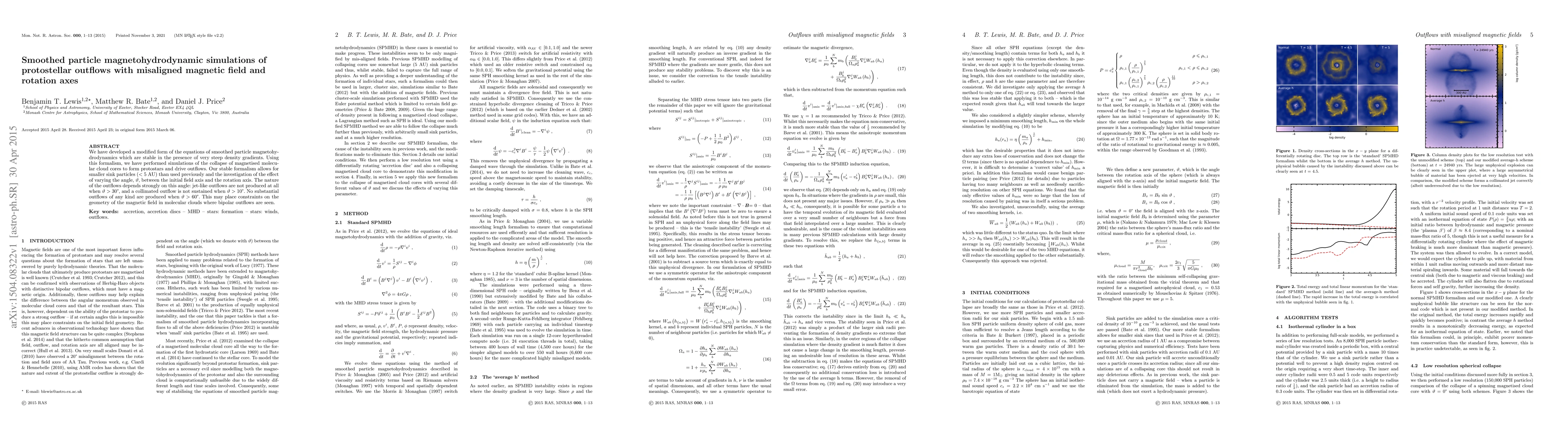 We have developed a modified form of the equations of smoothed particle magnetohydrodynamics which are stable in the presence of very steep density gradients. Using this formalism, we have performed simulations of the collapse of magnetised molecular cloud cores to form protostars and drive outflows. Our stable formalism allows for smaller sink particles (< 5 AU) than used previously and the investigation of the effect of varying the angle, {\theta}, between the initial field axis and the rotation axis. The nature of the outflows depends strongly on this angle: jet-like outflows are not produced at all when {\theta} > 30{\deg}, and a collimated outflow is not sustained when {\theta} > 10{\deg}. No substantial outflows of any kind are produced when {\theta} > 60{\deg}. This may place constraints on the geometry of the magnetic field in molecular clouds where bipolar outflows are seen.
