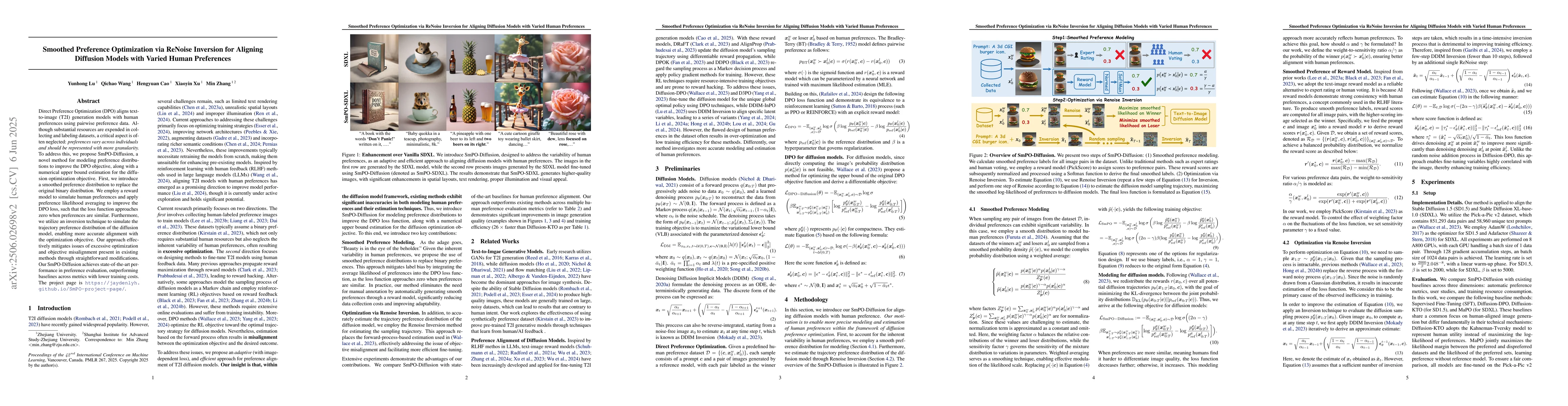 The research proposes SmPO-Diffusion, a method that models preference distributions to enhance the Direct Preference Optimization (DPO) objective for text-to-image generation models. It introduces a smoothed preference distribution, uses a reward model to simulate human preferences, applies preference likelihood averaging to refine the DPO loss, and employs an inversion technique to align with the diffusion model's trajectory preference distribution.