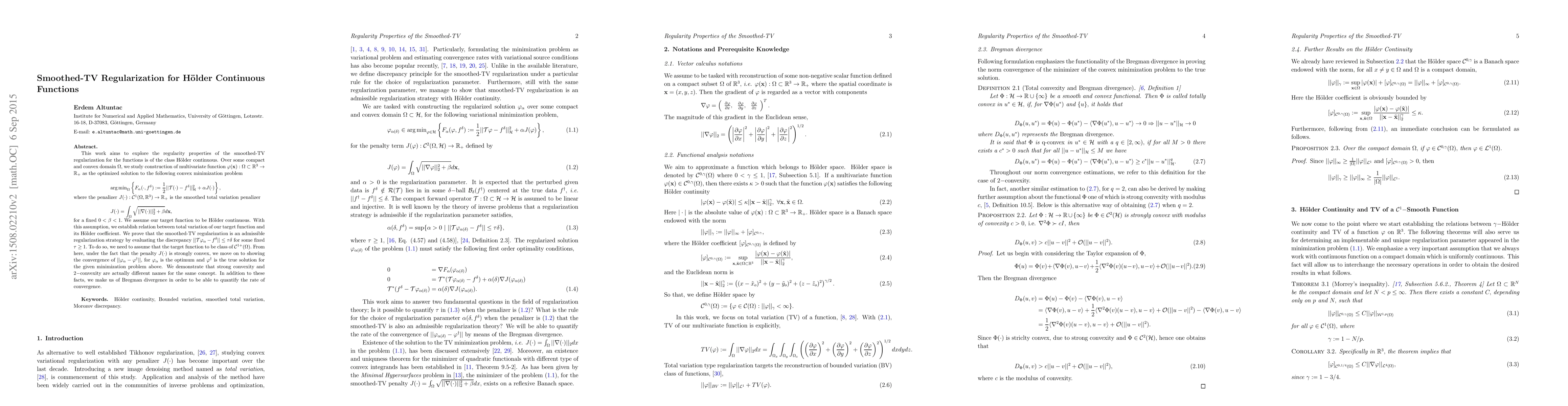 This work aims to explore the regularity properties of the smoothed-TV regularization for the functions is of the class H\"older continuous. Over some compact and convex domain $\Omega,$ we study construction of multivariate function $\varphi(\mathbf{x}) :\Omega \subset \mathbb{R}^{3} \rightarrow \mathbb{R}_{+}$ as the optimized solution to the following convex minimization problem \begin{equation} \min_{\Omega} \left\{F_{\alpha}(\cdot, f^{\delta}) := \frac{1}{2} \Vert \mathcal{T}(\cdot) - f^{\delta} \Vert_{\mathcal{H}}^2 + \alpha J(\cdot) \right\}, \end{equation} where the penalizer $J(\cdot) : \mathcal{C}^{1}(\Omega,\mathbb{R}^{3})\rightarrow \mathbb{R}_{+}$ is the smoothed total variation penalizer \begin{equation} J(\cdot) = \int_{\Omega} \sqrt{\Vert\nabla(\cdot)\Vert_2^2 + \beta} d \mathbf{x}, \end{equation} for a fixed $0 < \beta < 1.$ We assume our target function to be H\"older continuous. With this assumption, we establish relation between total variation of our target function and its H\"older coefficient. We prove that the smoothed-TV regularization is an admissible regularization strategy by evaluating the discrepancy $\Vert\mathcal{T}\varphi_{\alpha} - f^{\delta}\Vert \leq \tau\delta,$ for some fixed $\tau \geq 1.$ To do so, we need to assume that the target function to be class of $\mathcal{C}^{1+}(\Omega).$ From here, under the fact that the penalty $J(\cdot)$ is strongly convex, we move on to showing the convergence of $\Vert\varphi_{\alpha} - \varphi^{\dagger}\Vert,$ for $\varphi_{\alpha}$ is the optimum and $\varphi^{\dagger}$ is the true solution for the given minimization problem above. We demonstrate that strong convexity and $2-$convexity are actually different names for the same concept. In addition to these facts, we make us of Bregman divergence in order to be able to quantify the rate of convergence.
