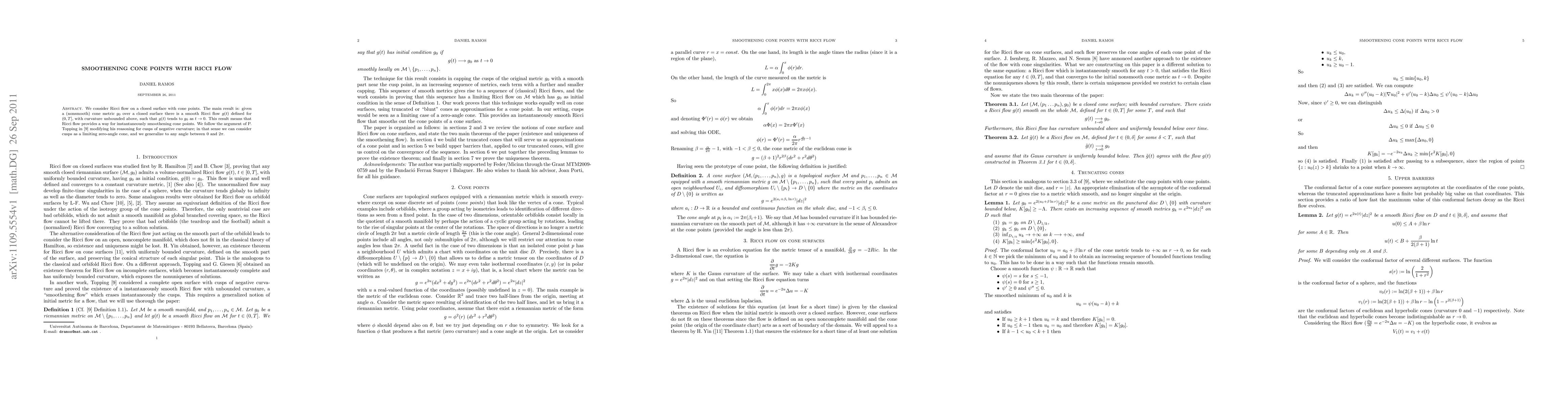 We consider Ricci flow on a closed surface with cone points. The main result is: given a (nonsmooth) cone metric g_0 over a closed surface there is a smooth Ricci flow g(t) defined for (0,T], with curvature unbounded above, such that g(t) tends to g_0 as t tends to 0. This result means that Ricci flow provides a way for instantaneously smoothening cone points. We follow an argument of P. Topping modifying his reasoning for cusps of negative curvature; in that sense we can consider cusps as a limiting zero-angle cone, and we generalize to any angle between 0 and 2\pi.
